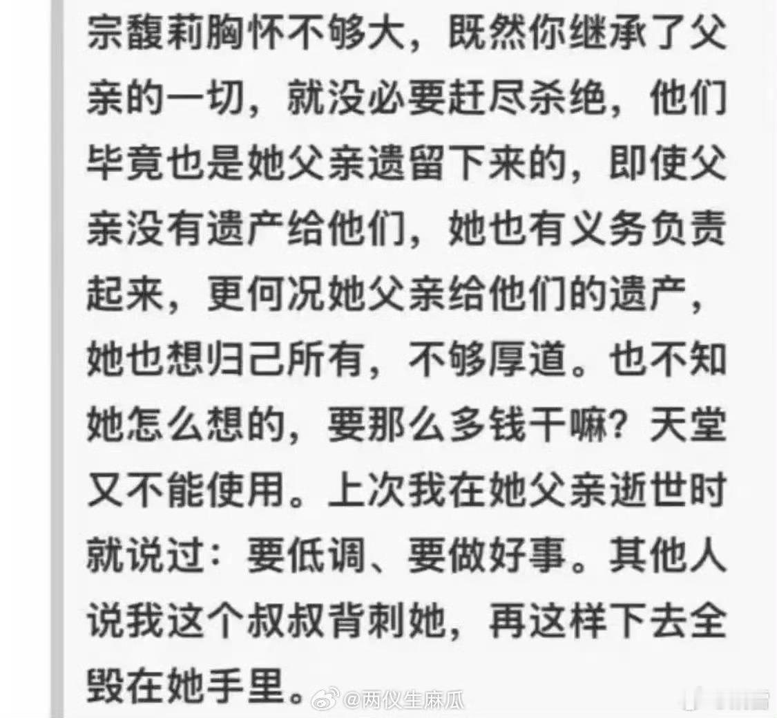 10月11日,宗馥莉的叔叔宗泽后在朋友圈表示:“好多朋友为宗馥莉第二次辞去娃哈哈集团的职务来问我。第一次辞的时候我在朋友圈发了下面这样一段话:昨天宗馥莉全网霸屏,很多人到我这里求证真假。我给他们基本答复:是件好事。她最大的问题是:接班娃哈哈不应该考虑如何做大规模,如何赚钱,如何大刀阔斧改变现状。她首先要考虑是如何做好事,做慈善。让所有人都认可你,在这个过程中你可以发现很多问题,也可以发现很多人才,自然而然让大多数人认可你的接班。她却反其道而行之,火力四开,锋芒毕露,应了古语:刚易折。第二:娃哈哈从本质上讲国家是大股东,当然是国家说了算,如果全是你自己的股份,当然你可以爱怎么干就怎么干,国有企业你就是个职业经理人,你就必须夹着尾巴做人。”