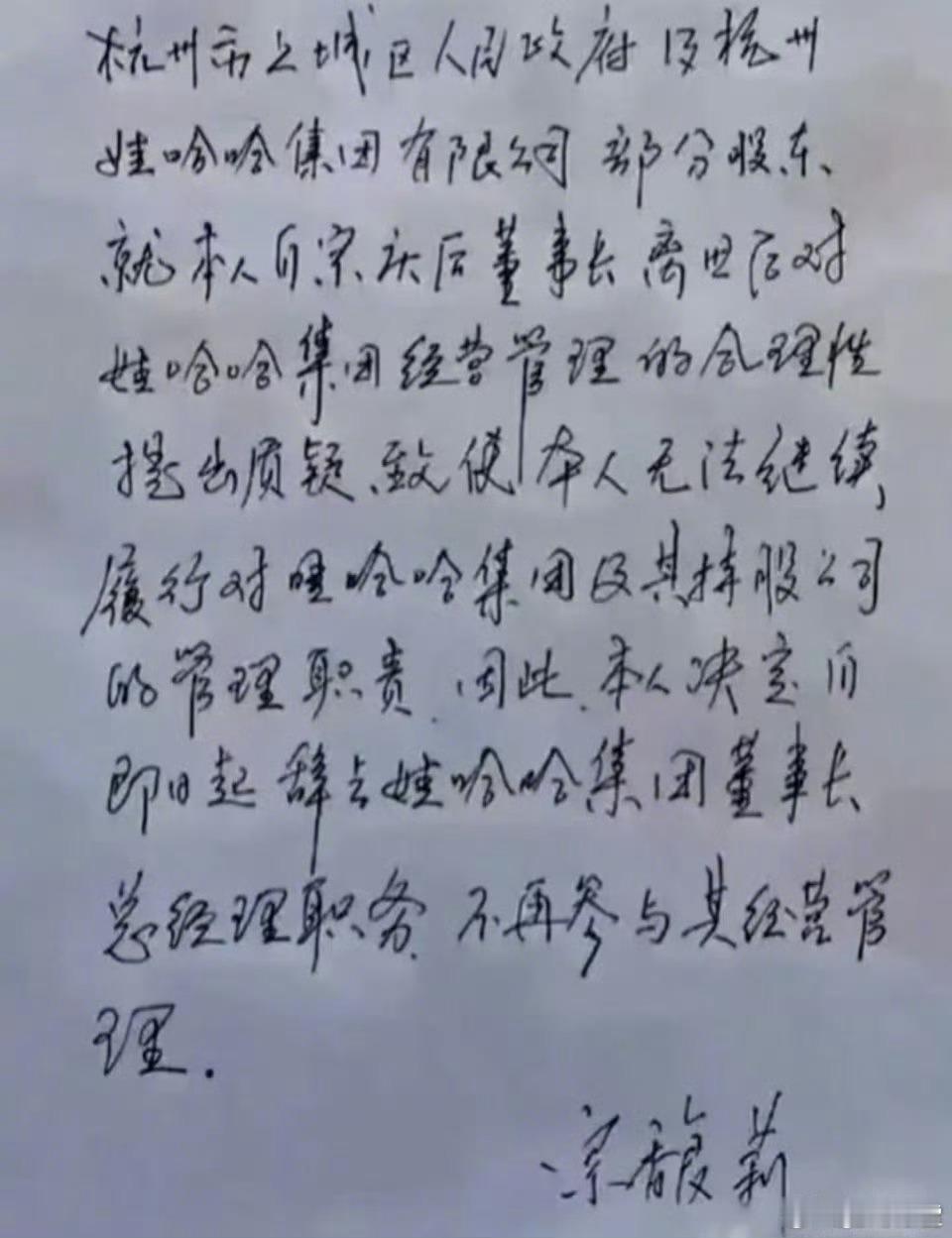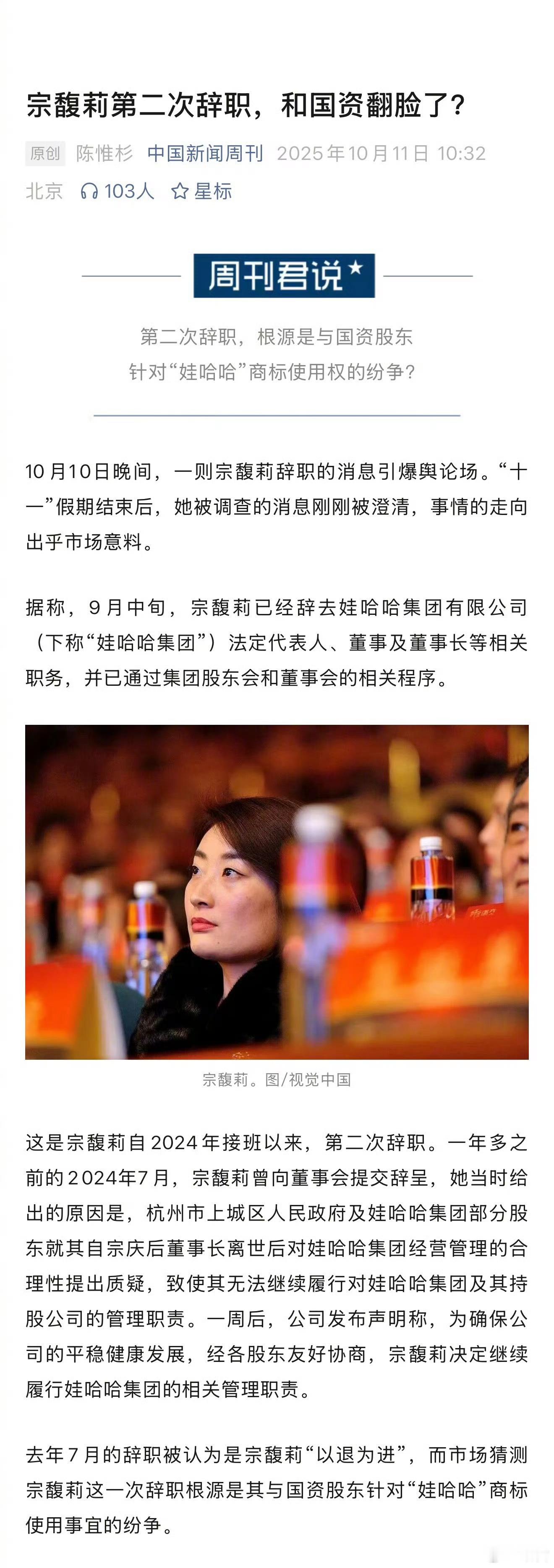第一财经:宗泽后发声【宗泽后称水军害了宗馥莉】10月10日,第一财经记者从接近娃哈哈的人士了解到,宗馥莉已于9月12日向娃哈哈集团有限公司辞去董事长等相关职务并已通过集团股东会和董事会的相关程序。