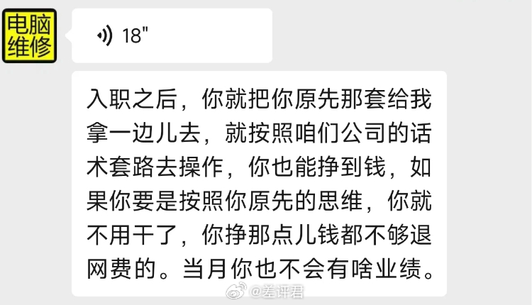 而行业里也早存在着一些明文惯例,用于培训新人。遇到有钱的,好说话的,不懂电脑的,那直接往死里报价。一旦维修师傅还有点良心,报价不够狠?不好意思,“别干了,挣那点钱不够退网费的,当月也不会有啥业绩”。