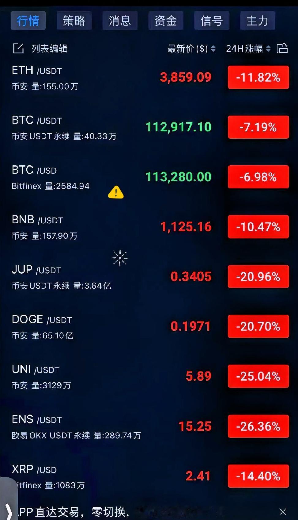 卧槽,牛逼。 昨晚特朗普在x上发长文, 威胁中国要在11月1日起,加税 100%。导致全球资本市场大幅下跌。 纳斯达克暴跌3.56%已经够吓人,没想到最惨的是币圈,直接演变成“血洗现场”。 大饼从12万砸到10万,以太跌掉近千点,bnb更狠,从1300崩到800,一堆山寨币直接腰斩再腰斩,跌超70%的一抓一大把。 不到一天,近200亿美元爆仓, 这阵仗简直复刻了当年的519惨案。 说白了,这哪是市场波动,就是特朗普一句话戳破了杠杆泡沫——敢加杠杆的基本全凉,反倒是持现货的能扛住冲击。 其实这也暴露了币圈的死穴: 看似去中心化,实则最怕这种 全球级别的政策风吹草动。特朗普前 阵子还喊着要让美国成“加密货币中心”,转头就用贸易牌把市场砸懵了。 这波血洗后, 你觉得是抄底的机会, 还是该彻底远离币圈这趟浑水? 评论区聊聊你的看法!