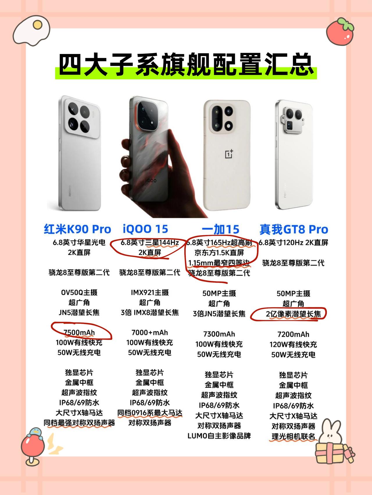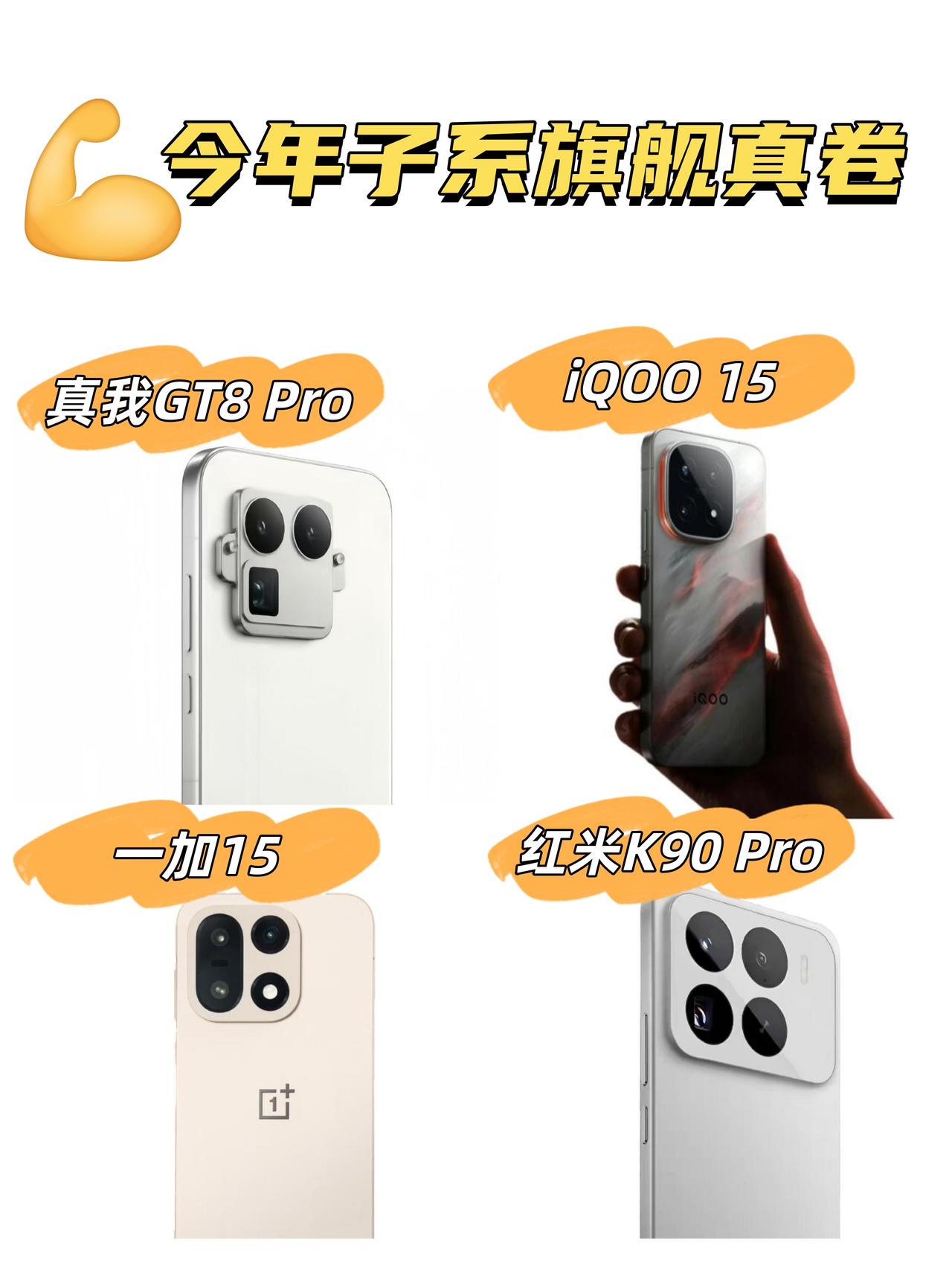 芜湖,今年子系旗舰都很卷啊! 🤔今年子品牌的手机都太卷了,按照站哥的爆料,iQOO15、红米K90 Pro、一加15、真我GT8 Pro都挺猛的,就看价格了! - iQOO 15:定制2K三星屏 一加15:新一代风驰游戏内核 真我GT8 Pro:2亿潜望长焦 REDMI K90 Pro:大底主摄+潜望长焦 - 目前来看👉最极致的游戏体验,选iQOO15和一加15 👉日用相对均衡体验,选真我GT8 Pro和红米K90 Pro