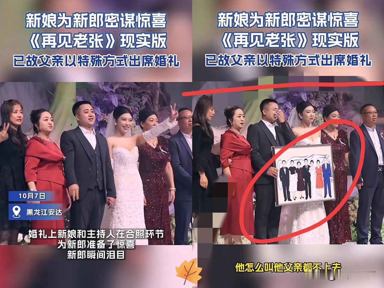 黑龙江一对新人结婚,到家人合影时,新郎却突然哭了,新娘看到后,不仅没有安慰,反而示意台下伴娘上台,掏出幅手绘全家福,上面居然画着已故的新郎爸爸!这波操作看完真的鼻子一酸! 新郎爸不在了,筹备婚礼那一个月,他总在半夜哭醒,这些新娘都看在眼里记在心里! 离婚礼还有半个月,她偷偷找了新郎爸最精神的照片,悄悄画进全家福里,就想让老人“也算参加了婚礼”! 新郎看见画的瞬间,眼泪直接绷不住,连婆婆都红着眼眶说“他要是看见,肯定高兴坏了”! 比起空口说“别难过”,新娘这种悄悄补全遗憾的用心,才是真的懂人。彩礼多贵、排场多大都没用,“记得你没说出口的痛”,才是感情里最难得的! 就像网友说的,“死亡不是终点,遗忘才是”,这张画让爸爸一直“陪着”新郎! 祝福!