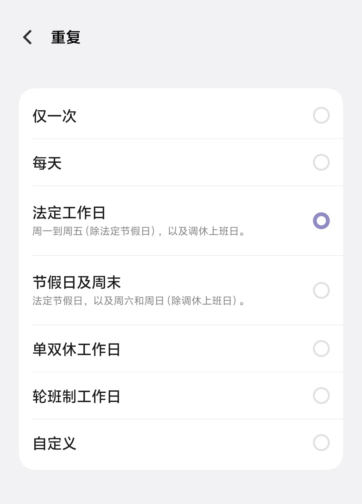 国产手机的闹钟不仅可以设置法定工作日或者法定节假日,就连单双休和轮班制都搞出来了,怎么排班都不怕闹钟不响。所以说啊,还是中国人懂中国人[doge][doge]