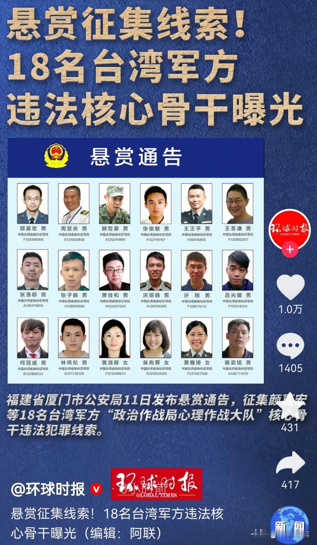 央视新闻消息,福建省厦门市公安局11日发布悬赏通告,征集颜嘉宏等18名台湾军方"政治作战局心理作战大队"(以下简称"心战大队")核心骨干违法犯罪线索。 公安机关表示,希望 台胞认清"台独"的极端危险性、危害性,以实际行动与"台独"分裂势力划清界限,积极提供相关违法犯罪线索,与大陆同胞携手反对"台独"分裂行径。 先从这些台独小喽啰开始,逐步将通缉令发向赖清德蔡英文等台独核心分子,号召鼓励台湾同胞活捉他们交给公安机关,祖国依法严惩!