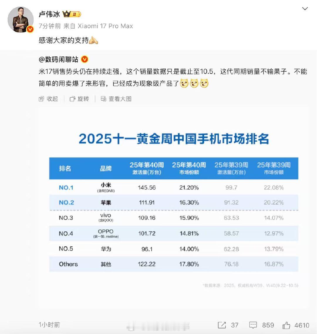 【卢伟冰回应小米17热销,小米17系列十一黄金周销量登顶】据数码博主消息,小米17系列销售势头持续走强,当前销量数据仅统计至10月5日,已稳居十一黄金周手机销量榜首。博主表示,这一代产品的表现“不能简单用卖爆形容”,同期销量不输苹果新品。对此,卢伟冰在社交平台回应:“感谢大家的支持。”业内分析认为,小米17系列凭借全焦段影像系统、澎湃OS 2.0与AI体验升级,已形成差异化优势。