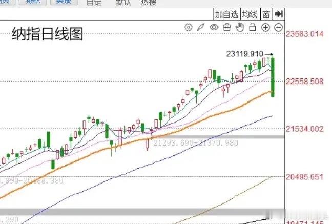 昨天晚上美股三大指数全线大幅度的调整,其中纳斯达克指数跌幅3.56%,创下了纳指自4月底上升波段以来的最大的单日大阴线。同时标普指数跌2.71%,道琼斯指数跌1.9%。美股三大指数都走出了“断头铡刀阴线”。大家请看图一,以纳斯达克指数为例,纳斯达克指数一根阴线杀穿了4根重要的均线,是典型的铡刀阴线走势。