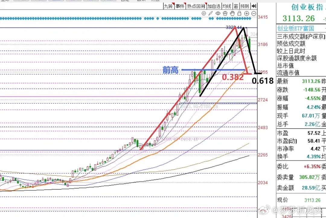 2955点是图三当中红色上涨波段的0.382回撤黄金分割位;是图三当中黑色上涨波段的0.618回撤黄金分割位;是日线级别前期高点支撑位附近。所以2955点被我定为短线创业板的强支撑点。