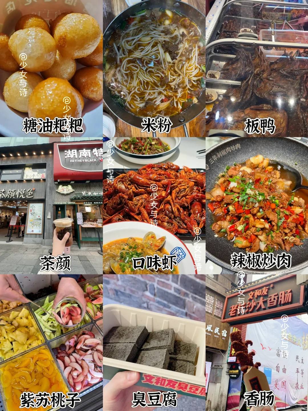 1️⃣吃喝:臭豆腐/大香肠/糖油粑粑18 口味虾60 紫苏桃子10 湘菜32 米粉9 茶颜16
