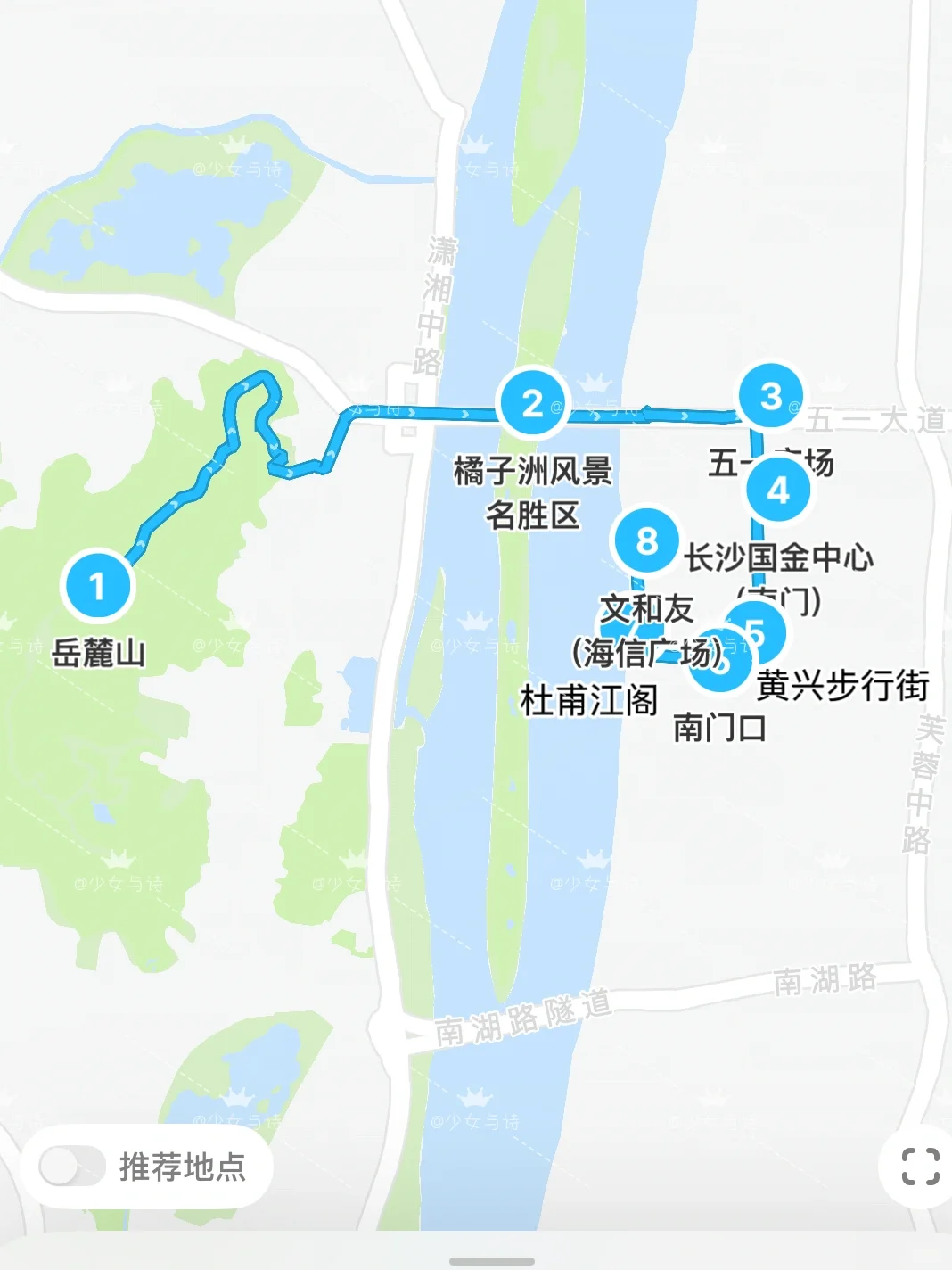 🗺️路线:岳麓山➡️橘子洲头➡️五一广场➡️长沙国金中心➡️黄兴步行街➡️南门口➡️杜甫江阁➡️超级文和友