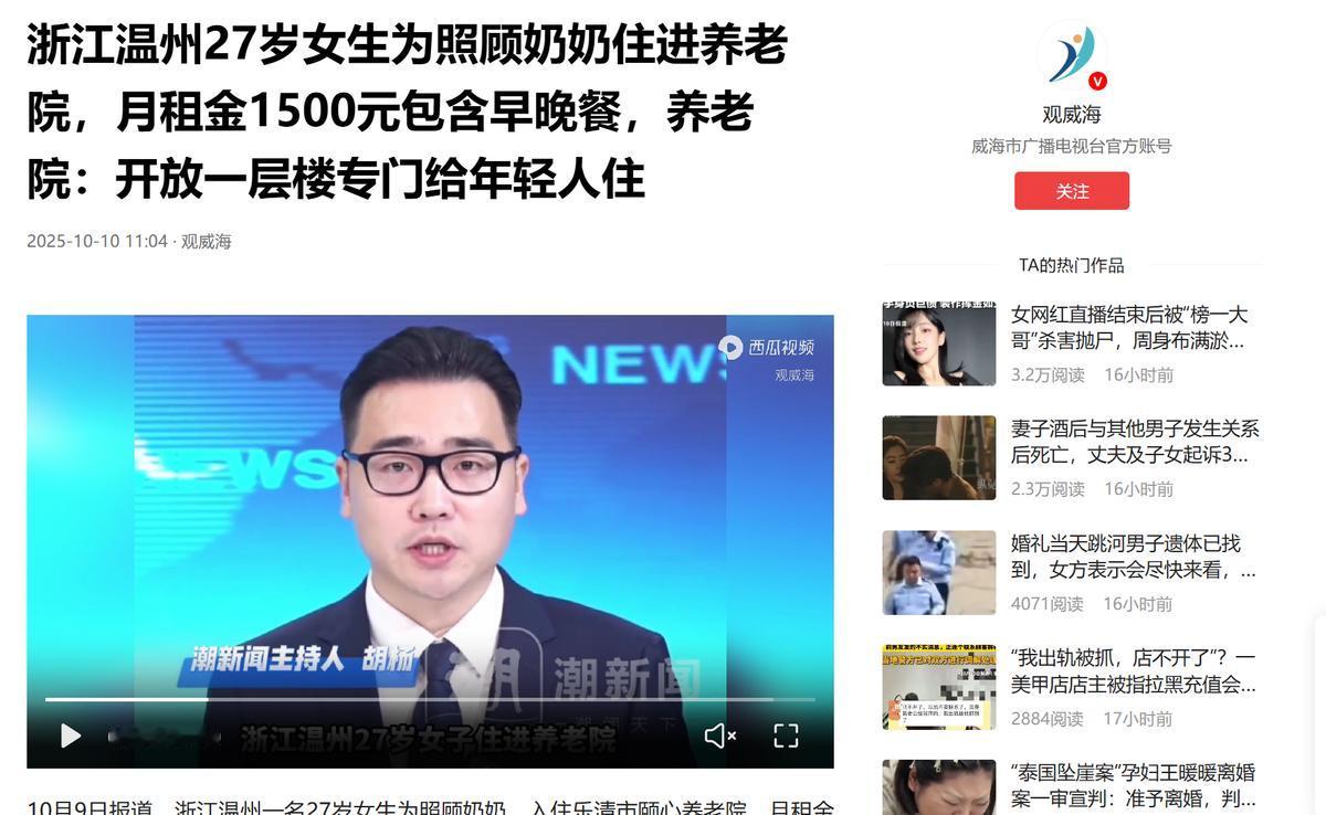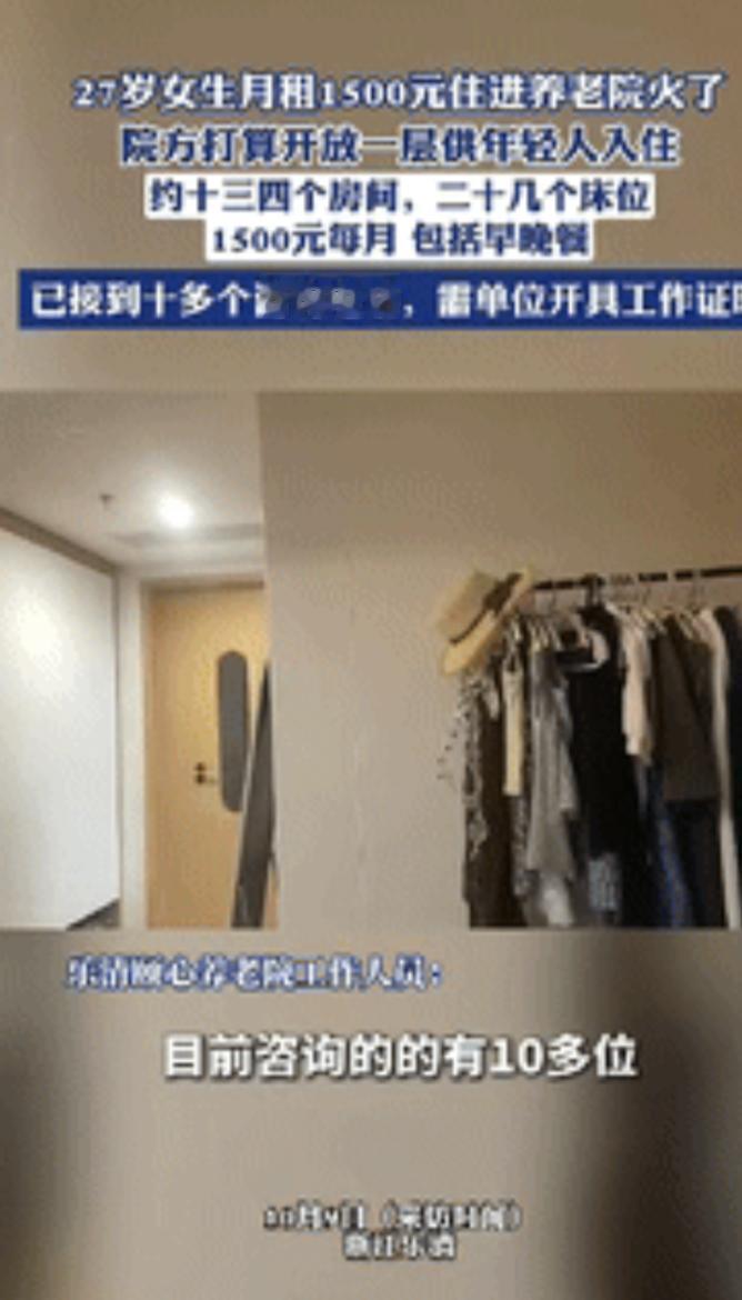 “人怎么能这么聪明!”浙江一27岁女子月租1500元,入住养老院,还包括早晚餐,不仅能照顾奶奶,离她工作的地方也近,生活作息还规律,女子将自己的经历发在网上后,没想到,养老院竟接到了十多个咨询电话,网友:还有吃的,可比租房划算太多了! 咱身边谁没为租房犯过愁啊?要么是工资一半都得搭进房租里,要么是为了省点钱,得住到郊区,每天通勤挤一两个小时地铁,晚上到家累得连口热饭都懒得做,还有合租的遇上作息不一样的室友,要么半夜被吵醒,要么厨房卫生间总抢着用,别提多闹心了。 可浙江乐清有个 27 岁的姑娘,却把租房这事儿玩出了新花样,你听完都得忍不住说一句:人怎么能这么聪明! 这姑娘没跟大伙儿一样,挤破头去抢公寓或者合租房,反而搬去了颐心养老院,一开始我还以为,就是姑娘孝顺,想多陪陪奶奶,可仔细一看才发现,这里面的门道可太多了。 先说位置养老院离她公司特别近,每天下班不用挤地铁挤公交,几步路就到了省下来的通勤时间,要么能多陪奶奶说说话,要么能自己歇会儿多舒服啊。 而且养老院里有规律的集体生活,到点吃饭、到点休息,不像自己住的时候,总忍不住熬夜刷手机,第二天又起不来,时间长了她的作息都变健康了。 最让人眼前一亮的还是经济账,这姑娘住的养老院,月租统一定的 1500 块,这还是后来咨询的人多了,院方才定下来的价,刚开始说不定还更灵活呢。 水电费得自己承担,但一个月下来也就 200 块左右,关键是!这 1500 块里还包含了早晚两餐!你想想外面租个单间,就算是老小区,在浙江那边怎么也得两千多起步,还不包水电伙食。 自己做饭吧,得买菜、洗菜、做饭、洗碗,费时间又费劲儿,点外卖吧一顿二三十,一天两顿下来,一个月也得一千多,这姑娘倒好,1500 块钱,不仅有地方住,早晚两顿热乎饭都解决了,算下来一个月比外面租房能省小一千,这账算得也太明白了。 她把自己住养老院的经历发在社交平台上之后,没想到一下子就火了,好多人都觉得这办法太妙了,网友们看完细节,都忍不住拿起计算器算,算完都感慨:“还有吃的?这可比租房划算太多了!” 不光是普通网友,还有两个准备考研的姑娘,听说了这事儿立马就交了费,就等着入住呢,为啥啊?因为养老院环境安静,管理又规范比在外面租房子更适合学习,不用操心邻居吵,不用操心今天吃啥,能安安心心复习,多省心啊。 这事儿火了之后,颐心养老院的电话都快被打爆了,光咨询的就超过 10 个,院方也挺机灵,没错过这个机会,院长在 10 月 9 号接受采访的时候就说,要趁着这个热度,搞一次大胆的尝试。 这家养老院一共六层楼,他们专门开辟出一整层,租给那些工作稳定、个人素质达标的年轻人,这哪儿是解决了一个姑娘的租房问题啊,这分明是在探索一个新路子,想把这种模式做得更规范。 而且这姑娘住得也特别舒服,院方把她安排在奶奶隔壁的房间,你说这多贴心?既方便她平时照应奶奶,陪奶奶聊聊天、帮奶奶搭把手,又能各自保留私密空间不会互相打扰。 当然了住养老院也得守规矩,比如晚上关门时间早,还有门禁限制但这些都是小事,比起住得舒服、省钱又方便,根本不算啥。 现在这模式还在试行阶段,但院方已经有了长远的打算,要是试行下来效果好,他们还想开放更多楼层,你回头想想,这姑娘多厉害啊! 别人都困在 “年轻人就该租公寓、合租” 的想法里,她却能跳出这个框框,看到养老院里的机会,既解决了自己的租房难题,又能陪奶奶,还帮养老院盘活了闲置的床位,让养老院多了稳定的收入,甚至还为其他有租房需求的年轻人指了条新路子。 (信息来源:观威海——浙江温州27岁女生为照顾奶奶住进养老院,月租金1500元包含早晚餐,养老院:开放一层楼专门给年轻人住)