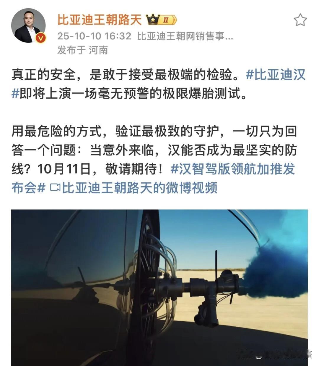10月10日,比亚迪王朝路天表示,比亚迪汉加推版新增了极限爆胎功能,类似场景高速爆胎。比亚迪 汉