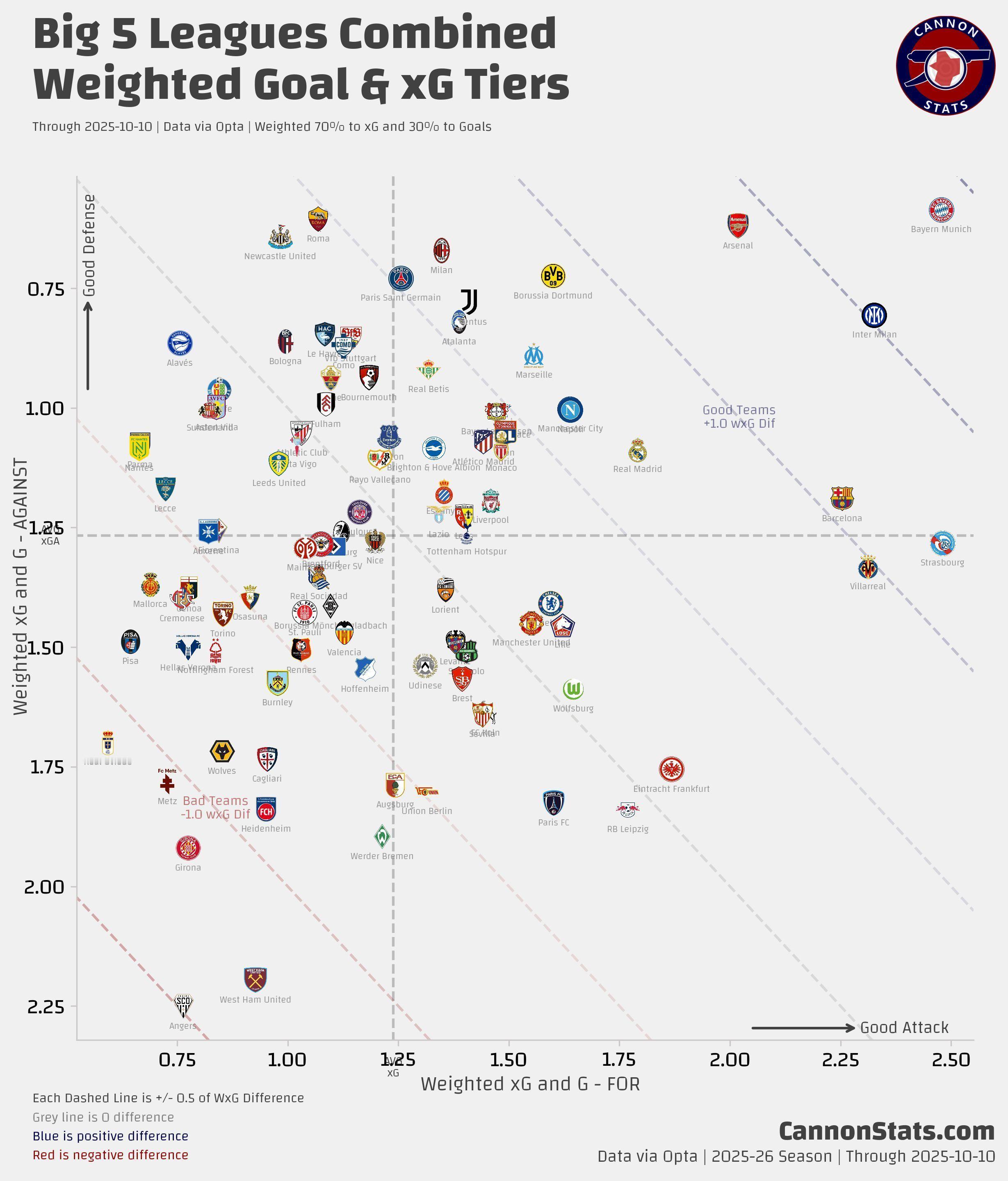 基于截至2025年10月10日的数据分析,阿森纳在攻防两端均展现出顶级水准。强大的攻击线(加权xG与进球数据优异)与坚固的防守(加权失球数据极少)形成了卓越的平衡,预期进球差(xG Diff)优势明显,客观地反映了阿森纳凭借体系化的稳定输出,成为目前欧洲五大联赛中表现最出色的球队之一。