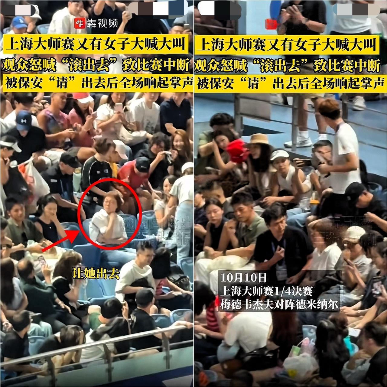 上海网球大师赛又 有一名女士被驱逐出球场。 这位女士在场边大“喊东亚病夫”, 导