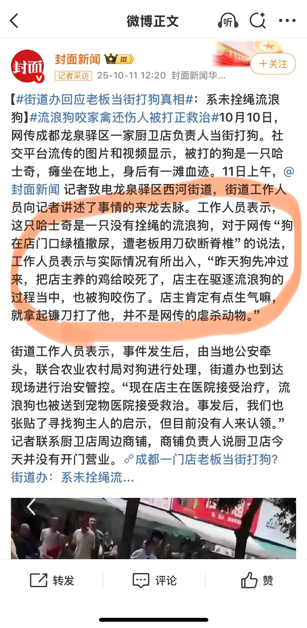 真的很恐怖,男人当街拿到砍断狗的脊椎血溅当场是不争的事实,完全反社会人格。这么血腥暴力的画面就这么出现在大街上,人来人往可能还有小孩目睹一切。事后为了合理化自己的暴力还要给一条死了的狗造谣。