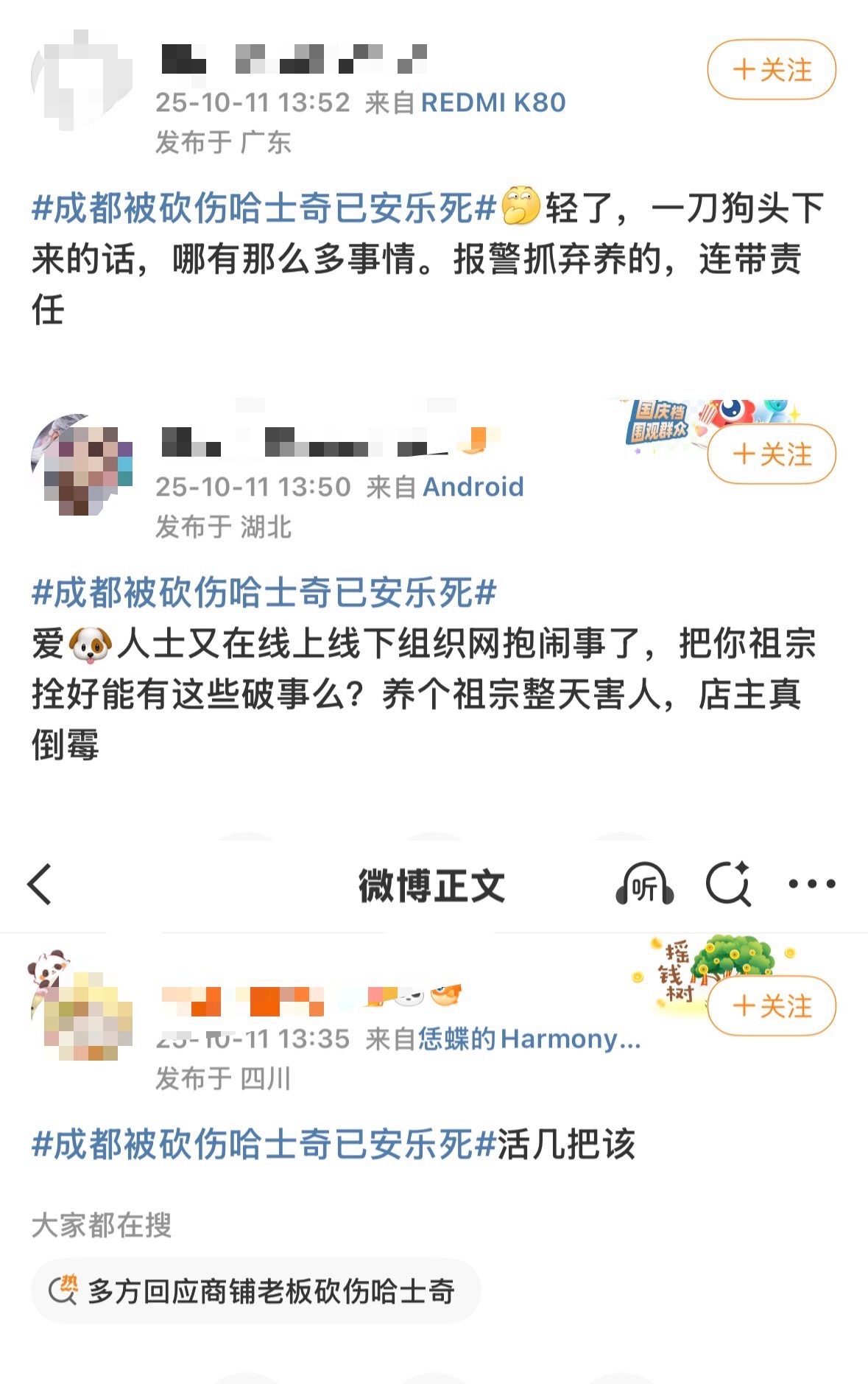 然后呢,我们的媒体发文称是哈士奇咬死了店主人养的鸡,店主上前制止被哈士奇咬了,才动刀砍狗。微博上的恨狗人士就开始高潮了:该死,畜生,为民除害。什么都骂一顿了还不忘嘲讽一下爱心人士。