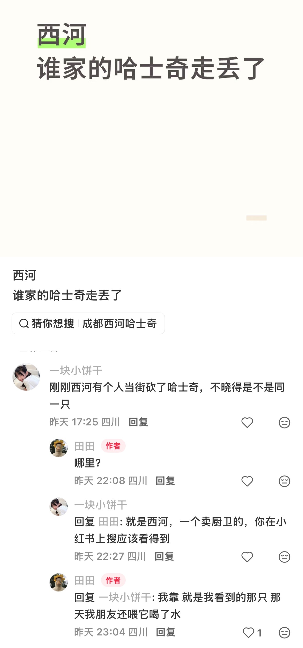 甚至前几条帖子都还是当地的爱心人士在给这只哈士奇发帖找主人或者领养,给它喂水喂吃的,旁边的店老板暂时收留它说它很乖所以没有驱赶它。谁知道下一秒帖子就更新,它被砍断了脊骨在大街上哀嚎