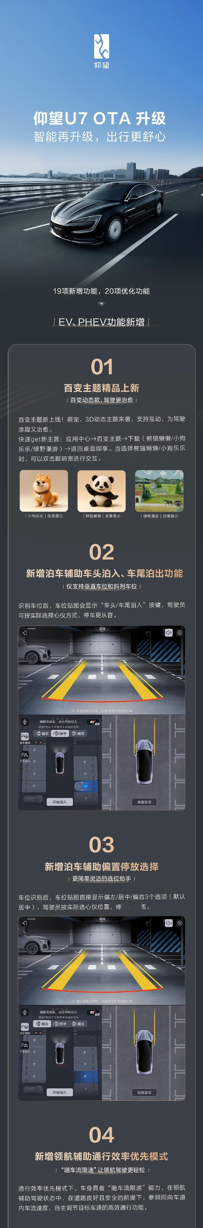 仰望U7 OTA升级来了! 新增19项+优化20项,泊车/智驾/底盘全焕新: ✅ 车头/车尾泊入任选,偏置停放防开门杀 ✅ 变道风格能调,底盘一键抬升过坎无忧 ⚠️ 注意:辅助驾驶选“通行效率优先”可能超速,脚不沾油门也别放飞自我哈[看] 升级耗时120-150分钟,记得找个地儿静静等它“修炼”。 这次升级算不算“加量不加价”的典范?你觉得最实用的是哪个功能?[思考]