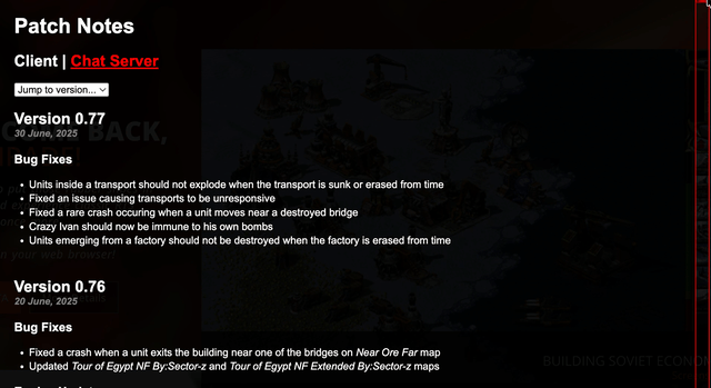 这个工程量到底有多大,没人知道。官网的更新日志密密麻麻记录了整整5年, 为了完美还原红警2的手感,甚至把某些原版bug也复刻了出来。。。所以,这么一个方便你游玩红警的网页项目,背后真下了很大的功夫。