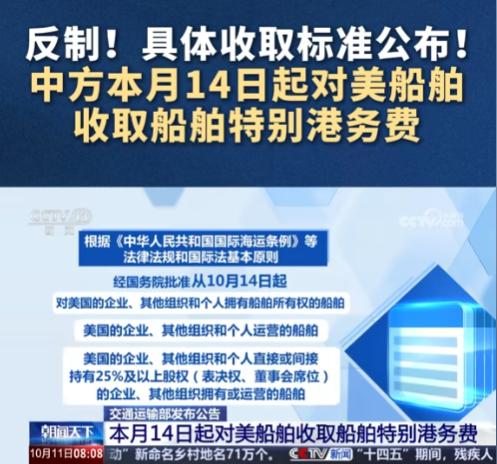 反击来了!3天后美国开始向所有中国船只收港口费,昨天中方正式宣布:对符合条件的美国船舶收取船舶特别港务费 早在几个月前,美国就宣布了要对我们加收港口费,本以为我们会硬吞了这口气,等着我们找过去谈判,结果谈的机会都不给,在生效前4天开始反击: 接下来符合这4个条件的船,也得向我们交港口费——美国企业、组织或个人拥有或运营的船舶 美国直接或间接持股25%以上的企业拥有的船舶、悬挂美国国旗的船舶、在美国建造的船舶。 生效时间也是10月14日,每吨收400元人民币,半年后涨240元,一直涨到2028年每吨1120元。 这就叫人不犯我我不犯人,人若犯我我必犯人,这不仅是警告,更是反击。 虽然说美国的船比我们的少,但别忘了美国持股的航运公司的船就不少了,这样一算下来,美国要付费的船也不少。 而且这个还只是个开胃菜,反击不单是对等的反击,还要精准的踩中对方的痛点,第二项措施是对准了稀土,对稀土相关技术等物项实施出口管制。 主要的核心内容就是对稀土的提炼设备、核心技术、人才以及材料等进行管制,让本就“一土难求”的美国更加雪上加霜。 与此同时,宣布对美国高通公司进行立案调查,当然这些都不是毫无缘由的针对,而是有理有据地反击。 谈的机会我们不止一次给过,合作的机会也给过,但美国却执意认为步步紧逼就可以达到目的,事实上这一招对我们不管用!