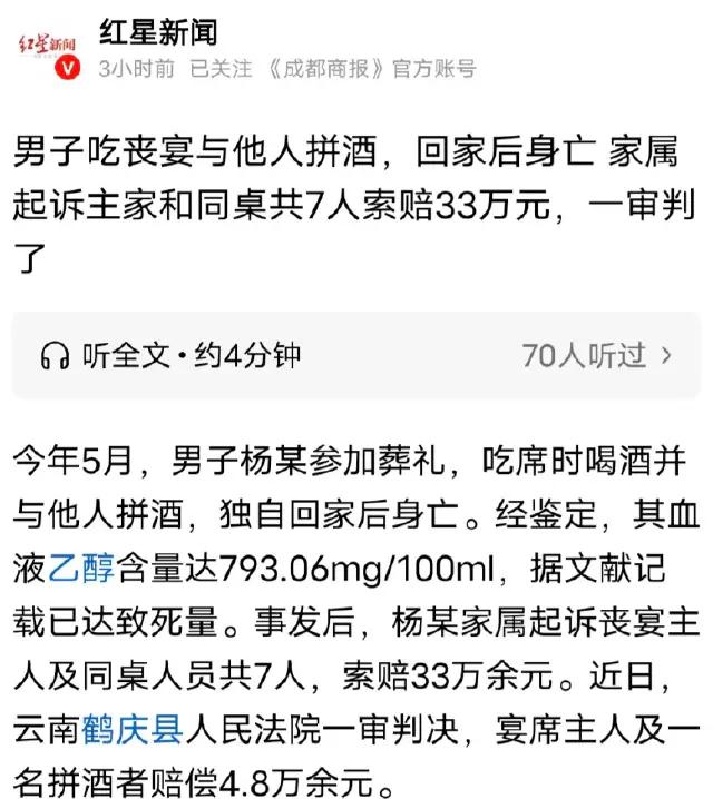 云南,母某甲为母亲办丧宴,采用自助餐形式,酒水自便。当晚,杨某来吃饭,与母某乙拼酒并发生言语冲突后,杨某独自离开。第二天下午,家属发现杨某躺在大门内水缸旁,身体僵硬,报警后鉴定其血液乙醇含量达致死量793.06mg/100ml,家属拒绝 尸 检后起诉了丧宴主人和同桌喝酒的6人,索赔330000元。 2025年5月5日,母某甲正为母亲的葬礼忙碌着,傍晚5点半左右,杨某听闻丧宴消息,想着人情往来,便匆匆赶来赴宴。 母某甲准备的丧宴是自助餐形式,酒水摆在一边,任宾客自取食用。 杨某进来后,和母某乙凑到了一桌。两人本就相识,坐下来后,边喝边聊,从家长里短聊到人生趣事,越聊越投机。 在酒精的作用下,气氛逐渐烘托了起来,不知怎么的,两人就开始拼起了酒。 你一杯我一杯,谁也不肯服输。周围的人偶尔看过来,也只是笑着摇摇头,觉得这不过是酒桌上常见的热闹。 可酒越喝越多,两人的情绪也渐渐失控,不知因为哪句话起了冲突。 母某乙涨红着脸,大声说着,杨某也不甘示弱,梗着脖子回怼。周围的人见状,赶紧过来劝和,可两人都上了头,谁也听不进去。 直到晚上7点40多,杨某突然一拍桌子,说了一句不喝了,然后摇摇晃晃地站起身,独自离开了母某甲家。 当时,谁也没有多想,只当他是喝多了去外面吹下风。母某甲正忙着招呼其他宾客,也没顾得上他。 5月6号下午,杨某的家属到家一进门,就看到杨某躺在大门内的水缸旁,全身僵硬,一动不动。 家属这才反应过来,赶紧跑过去查看,发现杨某已经没了气息,家属报了警。 警察赶到后,杨某的尸 体被送去鉴定,结果显示,他血液中的乙醇含量高达793.06mg/100ml,已经达到了致 死 的量。 可奇怪的是,家属拒绝进行 尸 检,死 因也因此无法进一步确定。 杨某的家属,觉得杨某的 死和丧宴脱不了干系,母某甲作为丧宴的组织者,没有尽到应有的责任,而同桌的6人,尤其是和杨某拼酒的母某乙,也有不可推卸的过错。 于是,一纸诉状将母某甲和同桌的6人给起诉了,索赔33万。 母某甲觉得自己好心办丧宴,已经尽到了最大的努力,母某乙更是觉得委屈,他说当时就是一时兴起拼了个酒。 同桌的其他5人也是叫苦不迭,他们觉得自己只是正常吃饭,既没有参与拼酒,也没有强迫劝酒,怎么也被牵连到了呢? 审理发现:原来,杨某平时就爱喝酒,酒量也不算小,但那天不知道怎么回事,就喝成了这样。 而母某乙,虽然平时也爱喝酒,但并没有恶意要害杨某。 那么,该如何以法律角度看这件事呢? 1,母某乙和杨某拼酒的行为。 从法律层面说,虽然拼酒本身不是明确被法律禁止的行为,但母某乙作为成年人,明知过量饮酒存在极大危险,却仍与杨某拼酒,最终导致杨某血液酒精含量达到致 死的量。 根据《民法典》第一千一百六十五条规定,行为人因过错侵害他人民事权益造成损害的,应当承担侵权责任。 母某乙这种拼酒行为与杨某死亡存在因果关系,存在明显过错。 毕竟他的行为,在一定程度上促成了杨某醉酒后 致 死的后果,他应该承担一定的责任。 2,母某甲作为丧宴组织者,他提供酒水并允许自助饮酒,这本身没问题。 母某甲有义务保障宾客的安全,在杨某醉酒后,没有对其进行劝阻,也没有安排人安全护送。 《民法典》第一千一百九十八条规定,宾馆、商场、银行、车站、机场、体育场馆、娱乐场所等经营场所、公共场所的经营者、管理者或者群众性活动的组织者,未尽到安全保障义务,造成他人损害的,应当承担侵权责任。 母某甲没有尽到安全保障义务,应该承担一定的过错责任。 3,杨某作为成年人,对自己的身体状况、酒量以及饮酒过量的后果应该有完全的认知能力。 杨某主动或者放任自己饮酒到危险程度,并且在醉酒后独自离开,他的这种行为,是导致自己 死 亡的直接原因。不能因为他已离世,就忽视他自己应承担的责任。 据《民法典》规定,完全民事行为能力人对自己的行为负责,杨某要为自己的不理智行为承担主要责任。 同桌的其他5人,他们没有参与拼酒,也没有强迫劝酒等行为,杨某的 死 亡 与他们确实没有直接关联。 不能过度扩大责任范围,不能因为在一个桌上吃饭就让他们承担责任。 最终,经审理后判决母某乙作为拼酒者,明知过量饮酒危险仍与杨某拼酒,致其血液酒精含量达致 死量,拼酒行为与杨某的 死 亡 存在因果关系,存在过错,需承担3%赔偿责任,赔偿28910.61元。 母某甲作为丧宴组织者,提供酒水并允许自助饮酒,却未对杨某醉酒状态劝阻或安全护送,未尽到安全保障义务,承担2%责任,赔偿19273.74元。 杨某作为成年人,对自身状况、酒量及后果有完全认知能力,却主动或放任饮酒至危险程度,拼酒及独自离开行为是死亡直接原因,需承担主要责任。 同桌其他5人未参与拼酒,无强迫劝酒等行为,杨某的 死 亡 与他们无直接关联,无需担责。