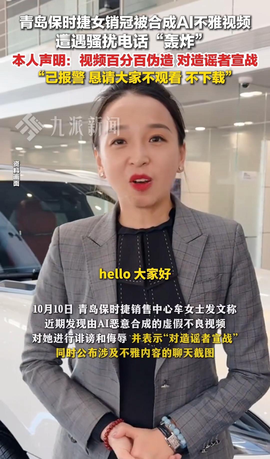 被造黄谣了! 被人用AI技术伪造不雅视频发到境外色情网站上了! 青岛保时捷女销冠选择了报警,她要拿起法律的武器来维护自己的权益,让那些造谣和诽谤者付出代价。 从最近几年的销售业绩来看,她太成功了,作为保时捷销冠是当之无愧。 2023年和2024年作为销冠的她连续两年卖出了170辆保时捷,最牛的是她能在一个月卖出27台,单日卖出4台车。 2025这才刚过去9个多月,她已经卖出了超过150台保时捷,这还是保时捷销量在中国销售下滑的情况下卖出去这么多台。 咱拿一辆保时捷100万的价格算,一年就她自己就能完成1.7个亿的业绩,甚至2025年可能会超过2个亿的销售业绩,都赶上一个创业公司的整体业绩值了,她真的是太牛了。 从视频看,她很漂亮有一种气质,也很有亲和力,专业和能力非常强,怪不得都找她订车。 她的客户百分之六七十都是女客户,她说也不是没有客户私底下约她吃饭,但她都拒绝了,所以很可能在男客户眼里是一个人“假清高”的人。 她被别人造黄谣,用AI换脸技术做成色情视频在外网传播,视频点击率高达900多万。 有看了视频的人,就对她进行骚扰,说看过视频了很刺激,要找她订车,甚至有的人还问找她订车有什么好的待遇吗,完全把她当成了用身体换业绩的女销冠。 为什么人们造她的黄谣或者说造那些有成就的人的黄谣,是她们有问题吗?显然不是。 只是她们用成功刺痛了某些人对性别、对财富、对流量的敏感的神经,就像是刺痛了躲在黑暗处的老鼠,高低咬你一口。 造谣者企图用最低成本、最黄暴的叙事来拉踩一个靠着努力站到金字塔尖的女性,把她们拉进“桃色泥潭”,完成典型的成功惩罚,他们则躲在见不得光的地方,暗暗自喜。
