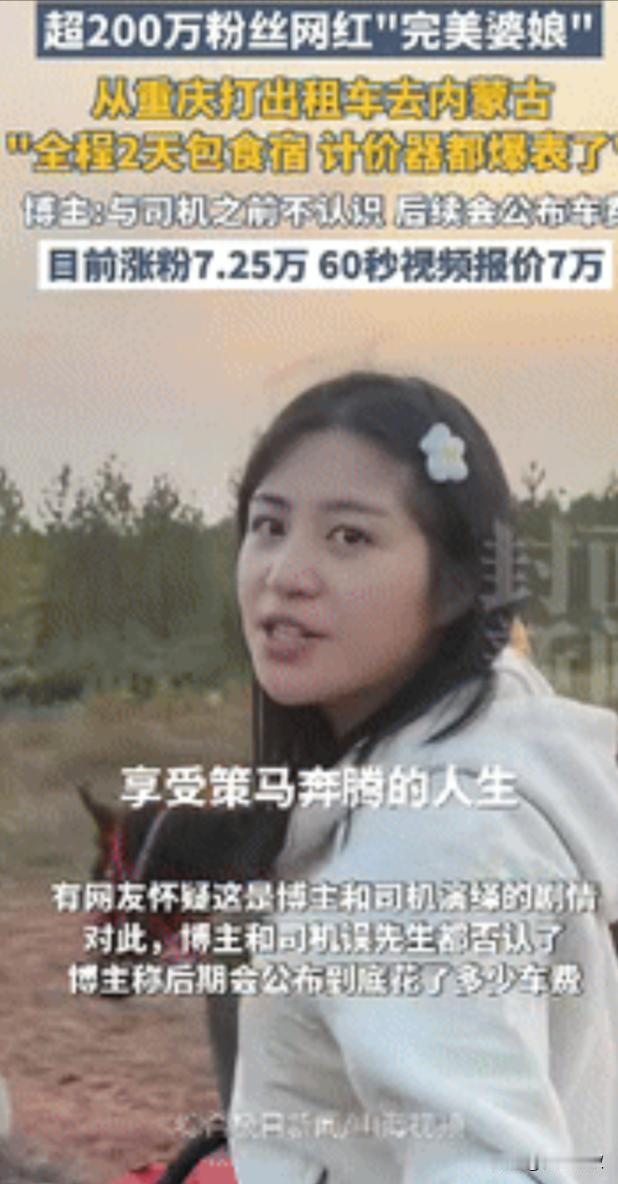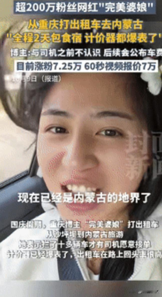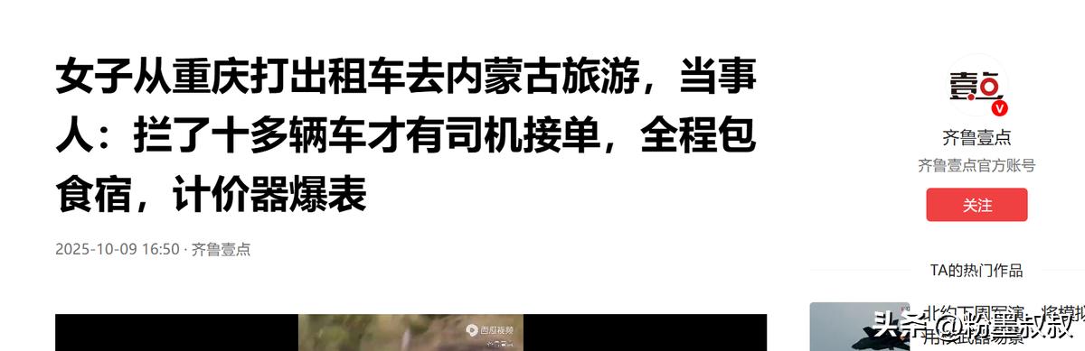 “有钱就是任性!”重庆一女子打出租车去内蒙古旅游,拦了10多辆车,才有司机愿意接单,全程2天包食宿,计价器都爆表了,进入内蒙古的地界后,出租车在路上回头率非常高,网友:还是太有实力了! 咱们平时打车,最多就是从家到小区门口、从公司到地铁站,顶天了也就跨个区或者去邻市,谁能想到啊,重庆有个女子直接要打出租车去内蒙古! 这事儿一听就透着不一般,她在路边拦车的时候,前前后后得有十多个出租车师傅,一听目的地是内蒙古,全都摆手拒绝了,真不是师傅们不想赚钱,实在是这单生意怎么琢磨都觉得悬。 这可不是跑趟机场那么轻松,从重庆到内蒙古光路程就有两千多公里,开过去得整整两天时间,师傅们心里都有本账:这一路上的油费、过路费得花多少? 万一开到内蒙古了,乘客突然说没钱付,那师傅们哭都没地方哭去,更别说这两天要是留在重庆本地拉活儿,早高峰接接上班族,晚高峰跑跑商圈,说不定能赚不少,这平白无故耽误两天,损失可不小。 还有那些看不见的麻烦,比如跨省拉活儿合不合规定,路上要是出点事儿,保险到底能不能报,全都是问号,所以后来终于有个师傅愿意接这单,圈里人都说要么是这师傅胆子大,要么就是把所有风险都想明白了,当然前提是价格和各种条款都提前说清楚了,不然这哪儿是拉活儿啊简直就是一场豪赌。 倒是这位女乘客挺大方,一早就跟师傅说,路上这两天全程包吃包住,不用师傅自己掏一分钱,可就算这样之前的十多个师傅还是没敢接,毕竟这生意太反常了,完全跟出租车平时的运营路子不一样。 最后出发的时候,有人注意到那辆出租车的计价器,跑着跑着数字直接跳过了上限,居然爆表了,你就想吧这得是跑了多远、算下来多少钱,才能让计价器都显示不下。 其实稍微算笔经济账就知道,这趟打车根本不划算,花的钱足够买好几张从重庆飞内蒙古的机票,到了当地之后,再舒舒服服包几天车,想去哪儿去哪儿,体验比坐两天出租车好多了。 可人家偏不就选了最费钱也最费时间的方式,难怪大家都忍不住说 “有钱就是任性”,等这辆挂着重庆牌照的出租车真的开进内蒙古地界,路上的人都忍不住回头看,回头率绝对是百分之百。 毕竟在内蒙古街头,很少能见到外地的出租车,还是从重庆开过来的,怎么看都新鲜,就跟移动的 “奇观” 似的,有人把这画面拍下来发到网上,一下子就传开了,网友们看完都评论说 “还是太有实力了”,要是没点钱谁会这么折腾着打车跨这么远啊。 当然也有人好奇,她到底为啥非要这么做,有人猜这会不会是故意策划的 “行为艺术”,就是为了在网上赚流量,现在不就是这样嘛,越离奇、越不按常理来的事儿,越容易火,“从重庆打车去内蒙古” 这话题本身就自带热度,而且她自始至终没说具体花了多少钱,有人觉得这是故意留悬念,好让大家多讨论几天,热度再维持久一点。也有人往别的方向想,会不会是她有特殊情况? 比如身体不好,坐不了飞机,也受不了高铁的颠簸,只能选出租车,或者是想在路上走走停停,顺便去沿途的地方办点事,不过这些猜测都没实锤,可能性也比 “有钱任性” 小多了。 不管她是为了流量还是有别的原因,能做出 “从重庆打车去内蒙古” 这种事,本身就超出了大多数人的认知,普通人出门都会算着怎么省钱、怎么方便,可她完全不用考虑这些,想选哪种方式就选哪种,这不就是 “有钱就是任性” 最直接的样子嘛。 (信息来源:齐鲁壹点——女子从重庆打出租车去内蒙古旅游,当事人:拦了十多辆车才有司机接单,全程包食宿,计价器爆表)