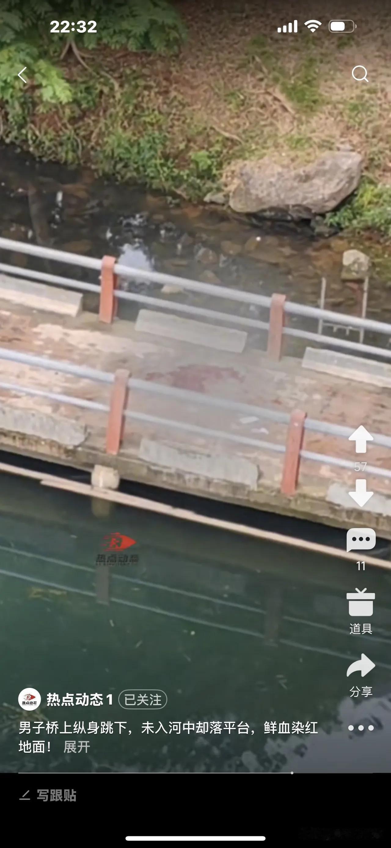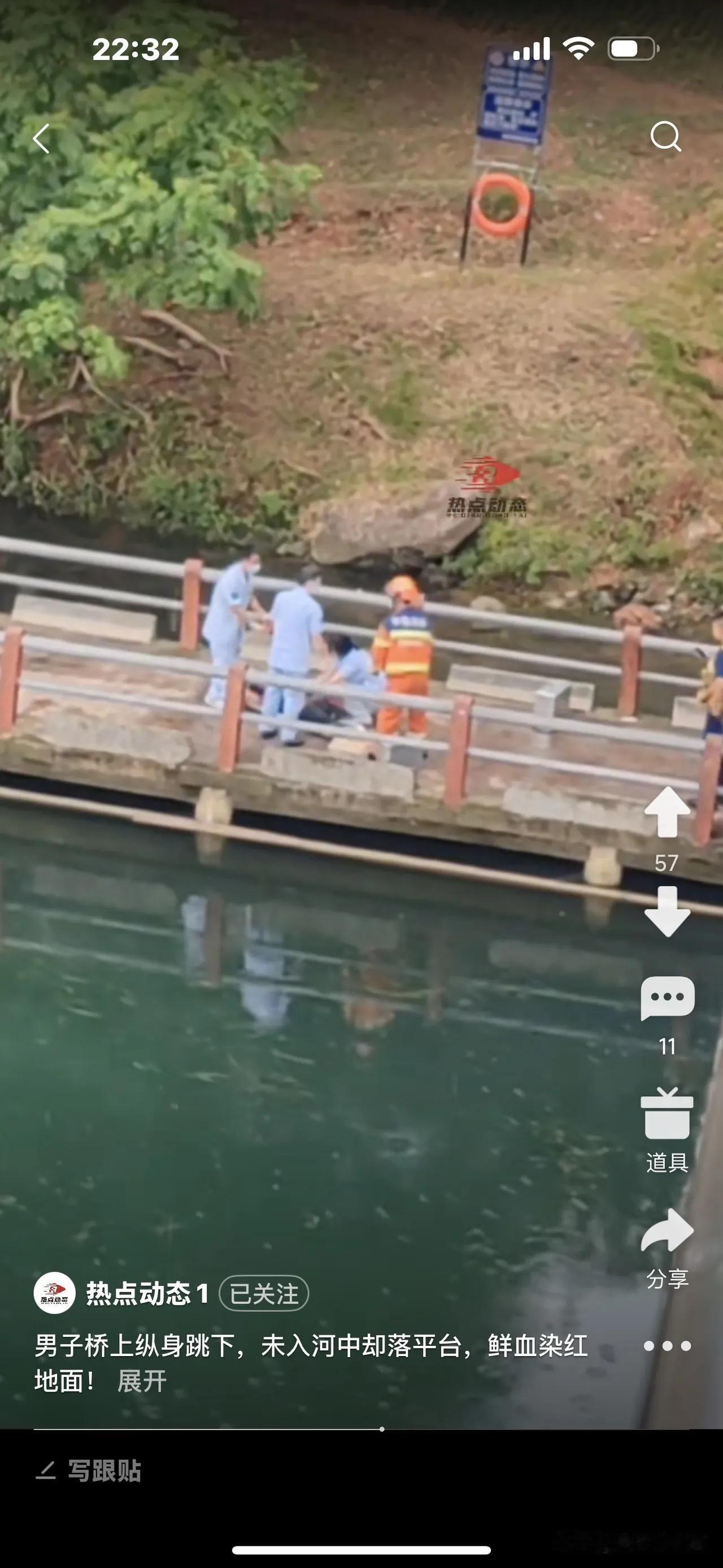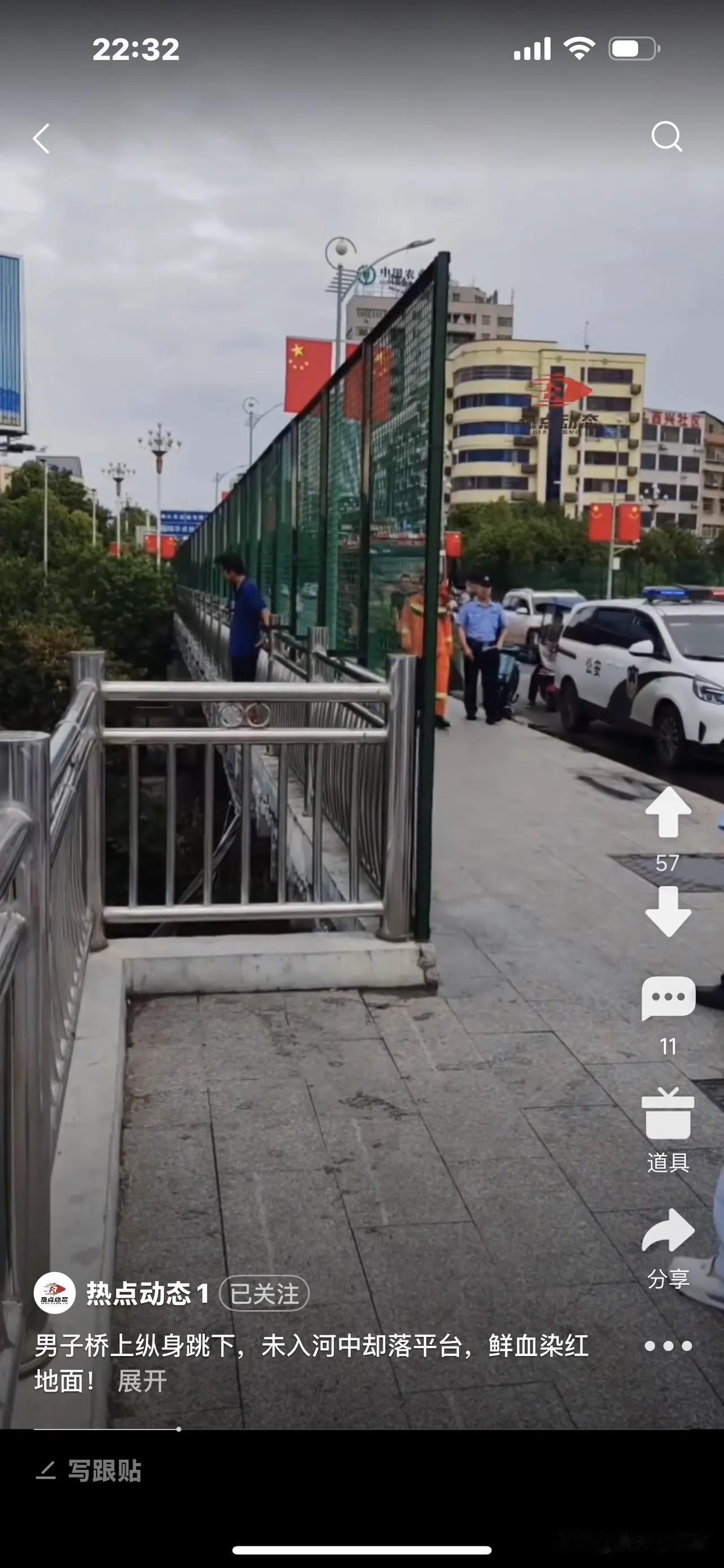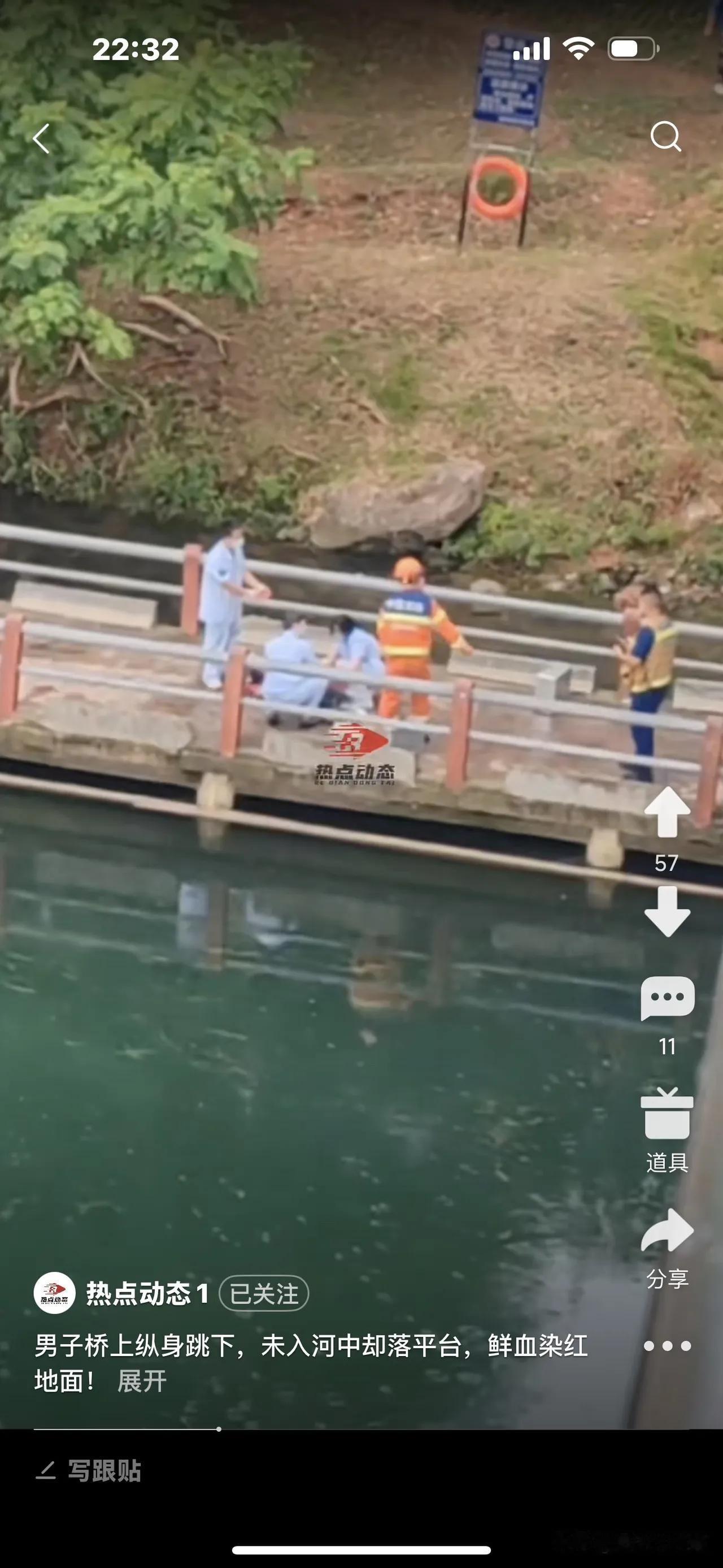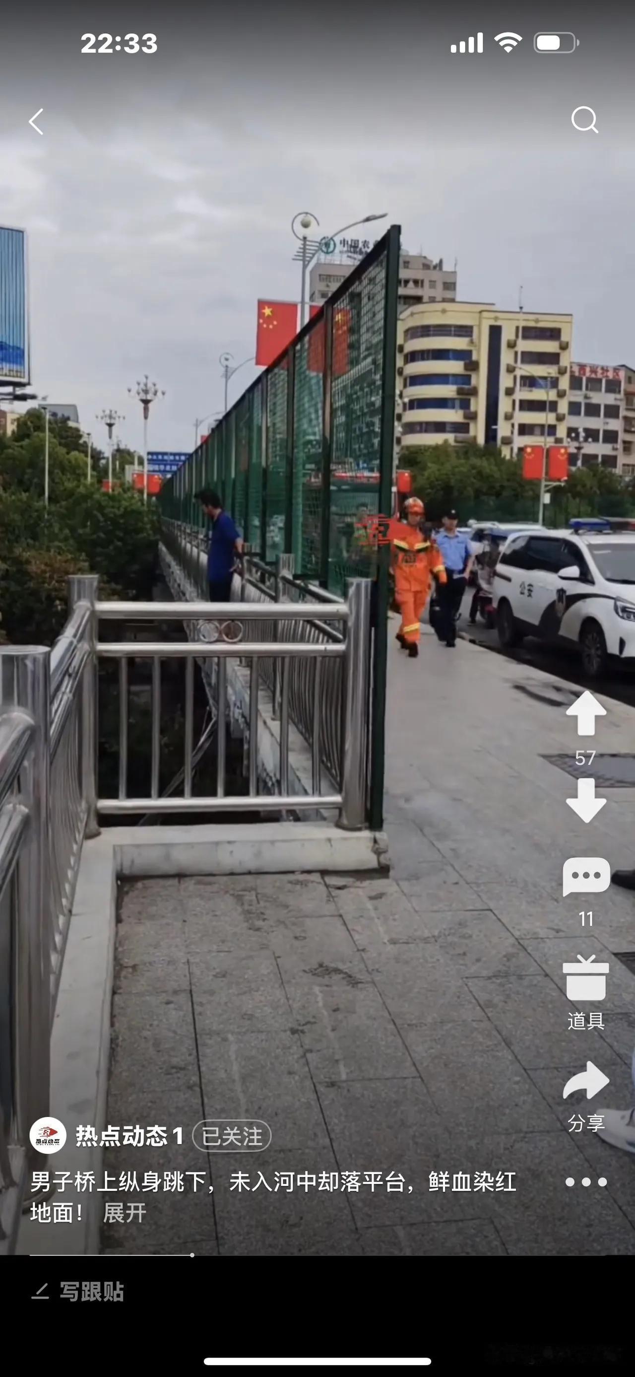 一三四十岁男子穿深蓝工装,在桥上钻出安全网栏站于边沿,欲跳河轻生。桥边停有白色警车,消防员与民警赶来营救,未及阻止,男子已跳下。 男子跳偏未入河,撞在坚硬平台上致地面血染。3名穿浅蓝衣服、戴白口罩的医生到场急救,后将男子抬离,现场留血迹。生活困境易让人钻牛角尖,生命仅有一次,需珍惜,跨过后终将海阔天空。 网友评论: 人的生命是无价的。人生只有一次,所以生命很宝贵。为什么有些人想不开自杀呢?人生除了生死。其余都是擦伤。我们成年人世界哪有一帆风顺。在人生的路上。每个人都坎坎坷坷。困难重重只要你有决心,一定能克服这些困难。最后一定能看到彩虹。遇到事情不要钻牛角尖。用积极的心态去解决问题。问题解决了,所以说人生有精彩。也有不如意的一面。所以我们遇到困难,迎刃而上。而不是打退堂鼓和放弃生活。祝我们的人生一路芬芳。