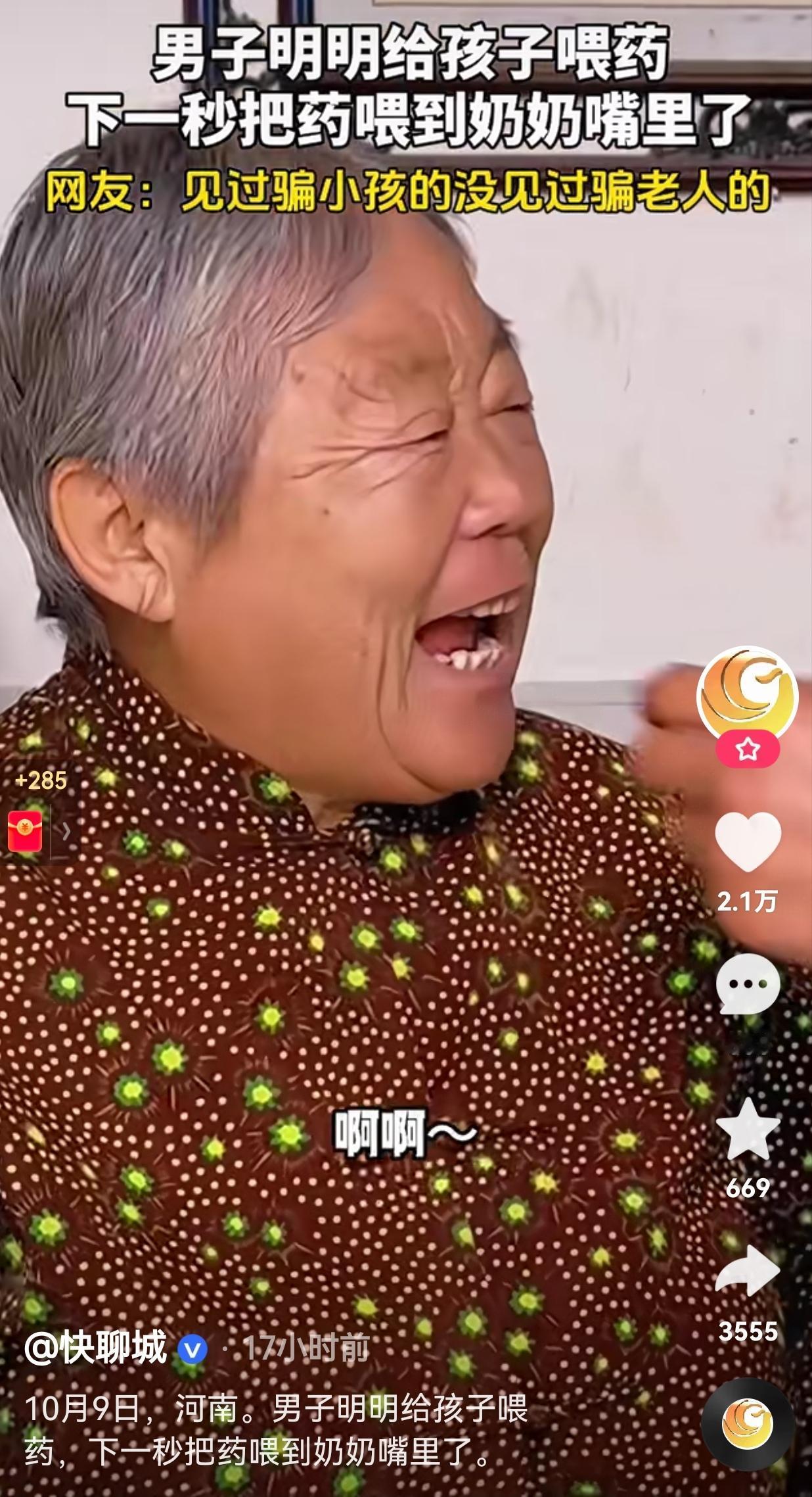 真的是倒反天罡!老人感冒了,孙子让奶奶喝药,奶奶嘴上答应的好好的,可是,就是不把喝完放在心上。不知道是不愿意喝药的缘故,还是忘记了!反正就是没有喝药。 怎么办呢?老人毕竟是家里的长辈,既打不得,又骂不得。 这天男子想出了一个点子,这个点子虽然不讲武德。但是,肯定能让奶奶乖乖就范。 只见男子和女儿在奶奶面前演了一出戏,剧情就是女儿不愿意喝药,男子拿着手里的药,逼迫女儿喝药。 你还别说,父女俩演的还挺认真的呢?女儿都被父亲吓哭了,而一旁的老人也当真了,还在劝孩子赶紧张嘴喝药呢? 结果呢?老人刚张开嘴巴,男子眼疾手快就把药灌到奶奶嘴巴里了!好一招声东击西。 奶奶喝到药后,一下子就愤怒了直呼男子:“你干啥呢?” 男子说:“那你感冒,让你喝药你为什么不喝呢?”说着说着就大笑了起来。 网友看到后评论说,见过骗小孩喝药的,还没有见过骗老人喝药的,真的是反了天了! 还有的网友说,小孩配合得还挺好,上一秒哭,下一秒笑!真的是天生的演员,知道什么时候该哭,什么时候该笑。 年龄大了!老人真的变成了我们口中老小孩了,真的是一点都不让孩子省心。虽然孙子的做法看似有点蛮横,不讲道理。但是孙子这样做也是迫不得已呀! 希望老人家不要埋怨孙子,也希望所有的老人不要太固执了,多听听晚辈的意见,不要一意孤行。 大家觉得呢?欢迎大家评论区讨论留言。