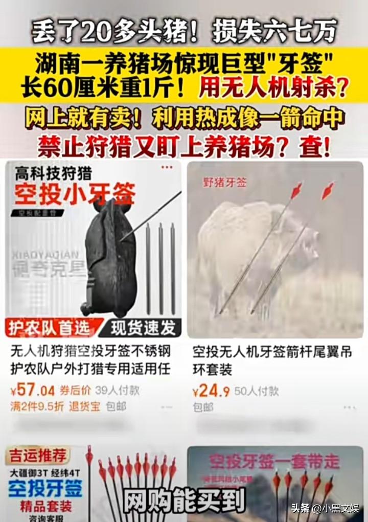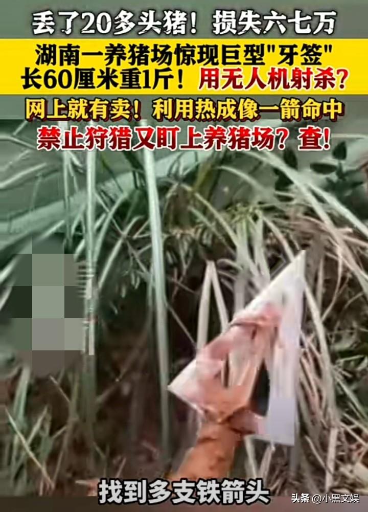 到底是什么人敢这么大胆? 想想都后怕,湖南一养猪场被人用无人机投放巨箭射杀猪。剪长达60CM,重约1斤。 20头猪惨遭杀害,现场遗留多只箭头。而据了解该款箭头网上就有售卖,无人机利用热成像投放箭射杀猪。 现在想想都可怕,利用无人机投放箭头射杀猪,要是误伤到人后果不堪设想。