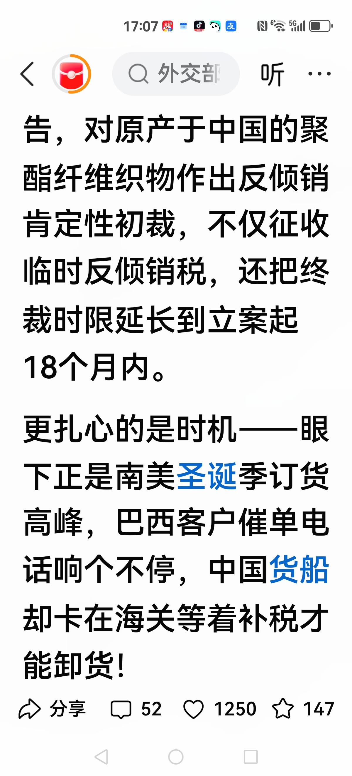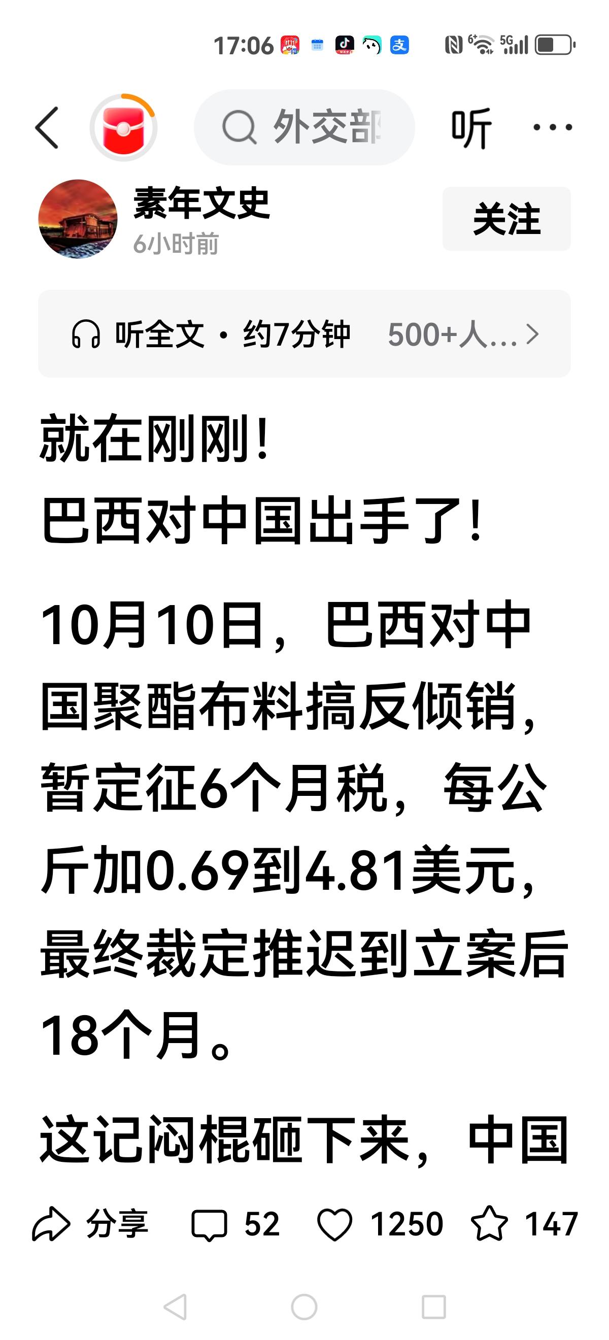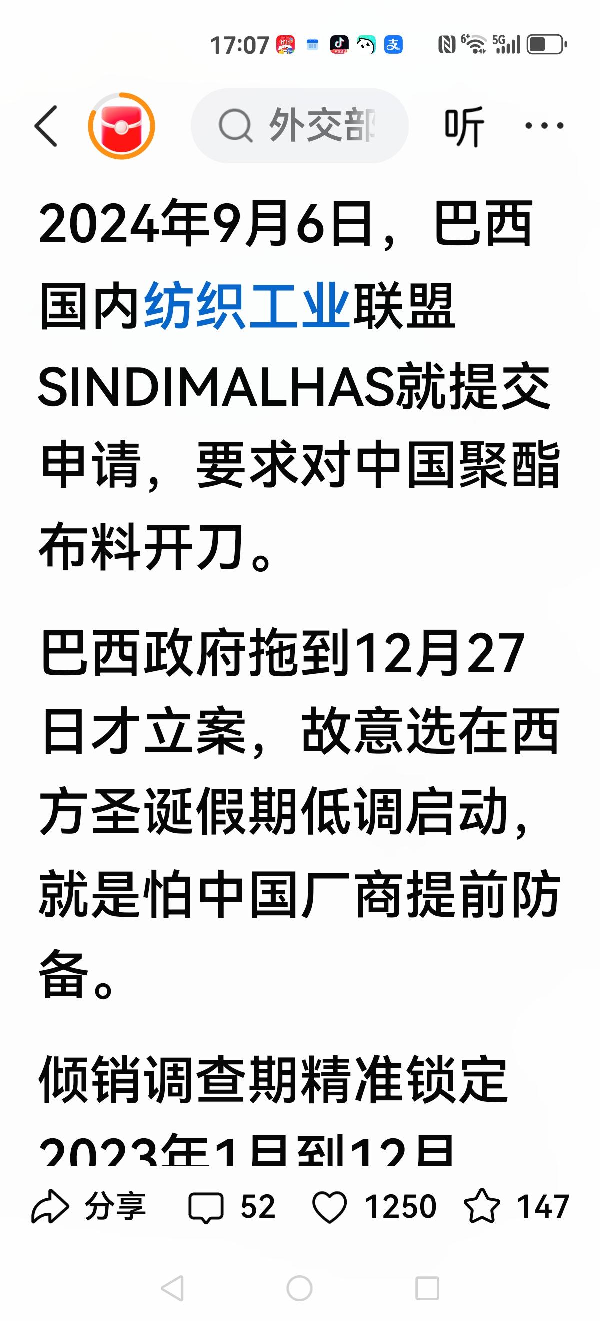 【前脚沙特白眼狼,后脚巴西又出手了】 为什么都敢于对我们下手?不怕报复吗? 巴西纺织联盟要求对我们聚酯布料开刀。 我们不干涉他国内政,也不结盟,那么怎么会有真正的利益上朋友? 特朗普为何敢于向我们开炮增加关税100%? 张维为,沈逸,金灿荣不是说美国离不开我们,打关税大战,美国货架一无所有吗? 现在不是美国,沙特,巴西都开始了,为什么?