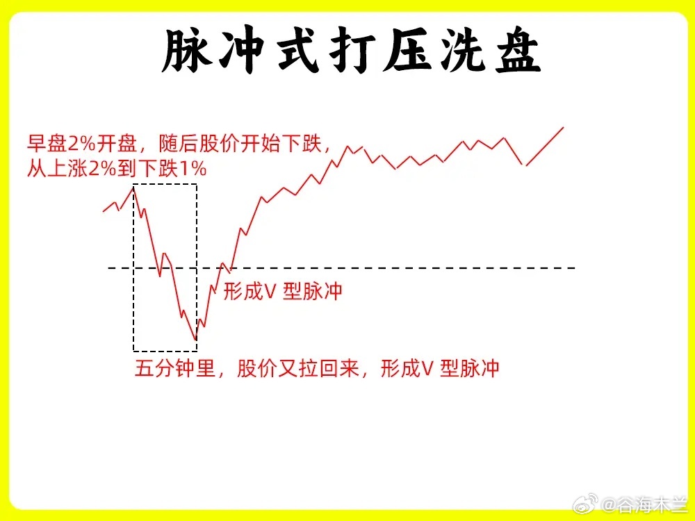 早盘以小幅高开(通常上涨2%左右)开盘,随后股价快速下跌,从涨2%直接跌至跌1%;但仅用5分钟左右,股价又迅速拉回,形成“V型脉冲”走势。这种手法属于“快速洗盘”,主力通过短时间的剧烈波动,快速清洗掉对股价波动敏感的不坚定筹码,洗完后迅速回归原有趋势。