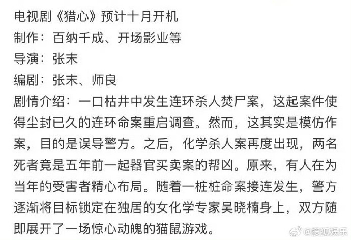 关于张小斐和于适新剧《猎心》即将开机的网传消息被提及,悬疑题材的设定搭配两人的合作,让剧集吸引了更多关注。网传张小斐于适新剧猎心即将开机网传张小斐于适合作悬疑题材