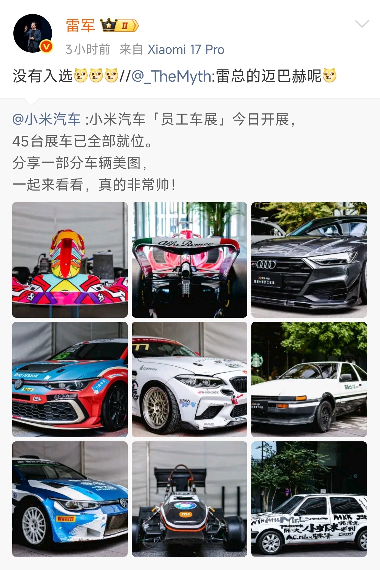 小米将举办首届员工车展 可惜不在北京,不然今天高低得要个访客码去科技园看车展,光看返图都不得不感慨小米员工们真的是卧虎藏龙了,各类BBA、TypeR、保时捷911乃至雷总的迈巴赫都已经烂大街了,居然有人能端处AE86这种梦想之车,甚至连F1都能搞一辆过来,可能上班儿于他来说就是找点事儿做打发时间吧[笑cry],不得不感慨小米的车文化是真的浓厚,大家都是玩车、懂车、爱车的人,也不难怪小米能做出SU7和YU7这样的好车~