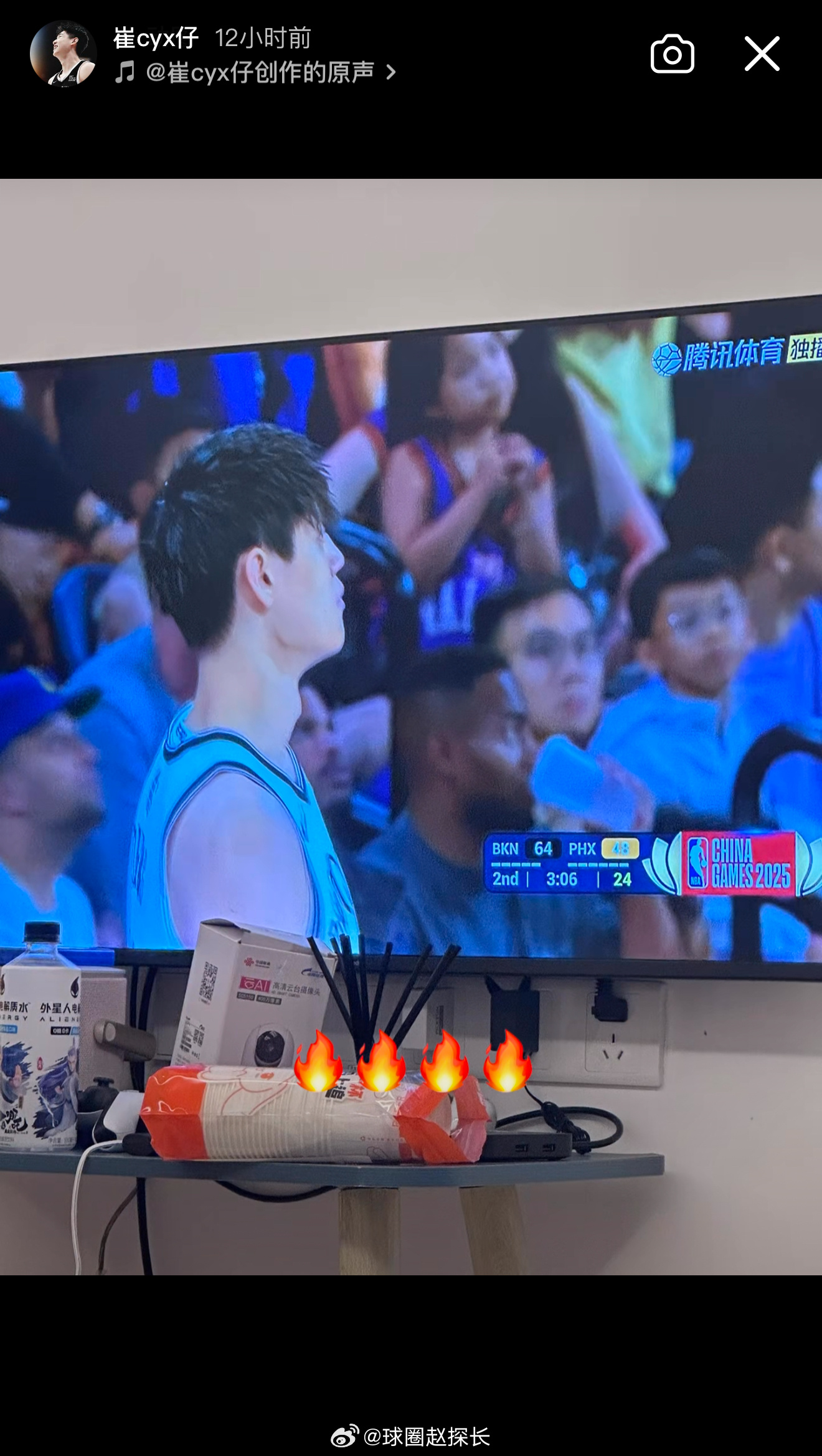 前篮网球员助威现篮网球员,崔永熙关注曾凡博篮网首秀,配文:🔥🔥🔥🔥