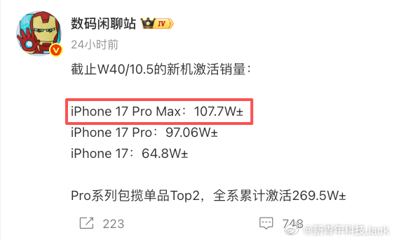 iPhone17系列激活量曝光 都说今年标准版真香,但卖得最火的还是ProMax版本[泪奔]我感觉标准版会在今年双11折扣后,有一波激活量销量大爆发,明年618也会有一波爆发,标准版用户都是追求性价比,不是超大杯顶配那种追首发不差钱的用户。小米17 这边也是这个道理,前期就是库库卖 Pro 后期标准版调价销量发力。
