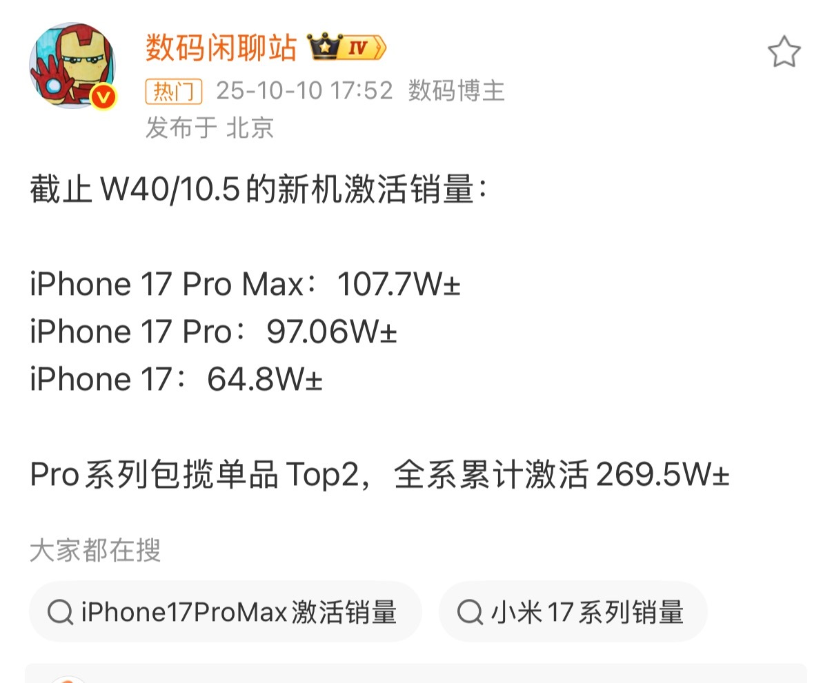 iPhone17系列激活量曝光太猛了,居然还是Pro Max卖的最好,马上就到双11了,相信销量还会猛增一波。