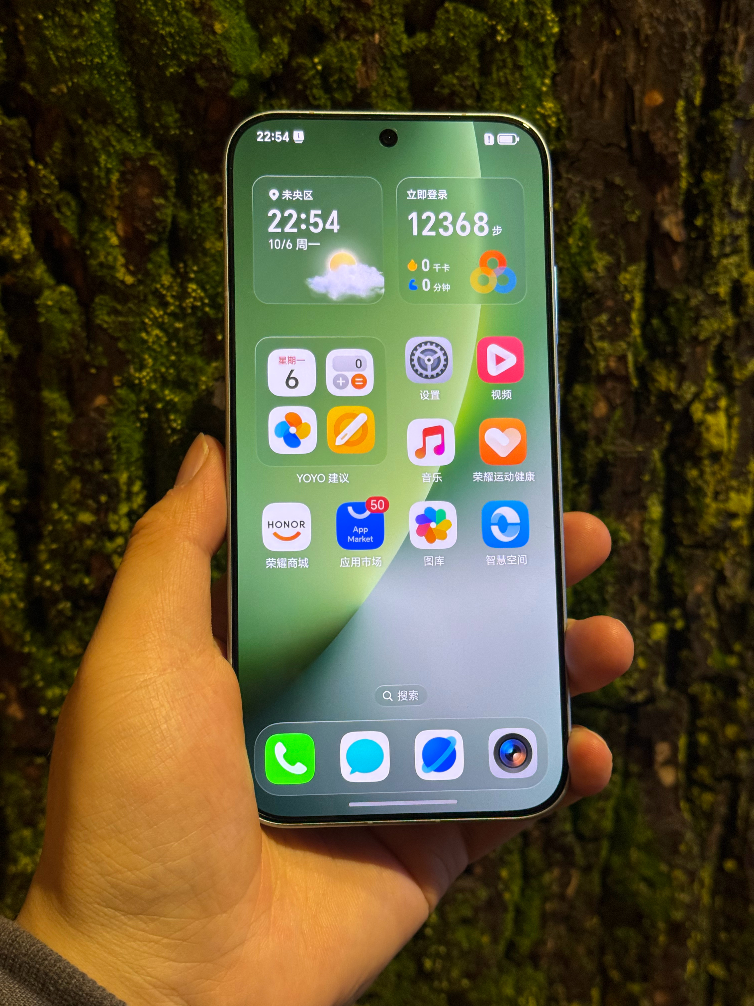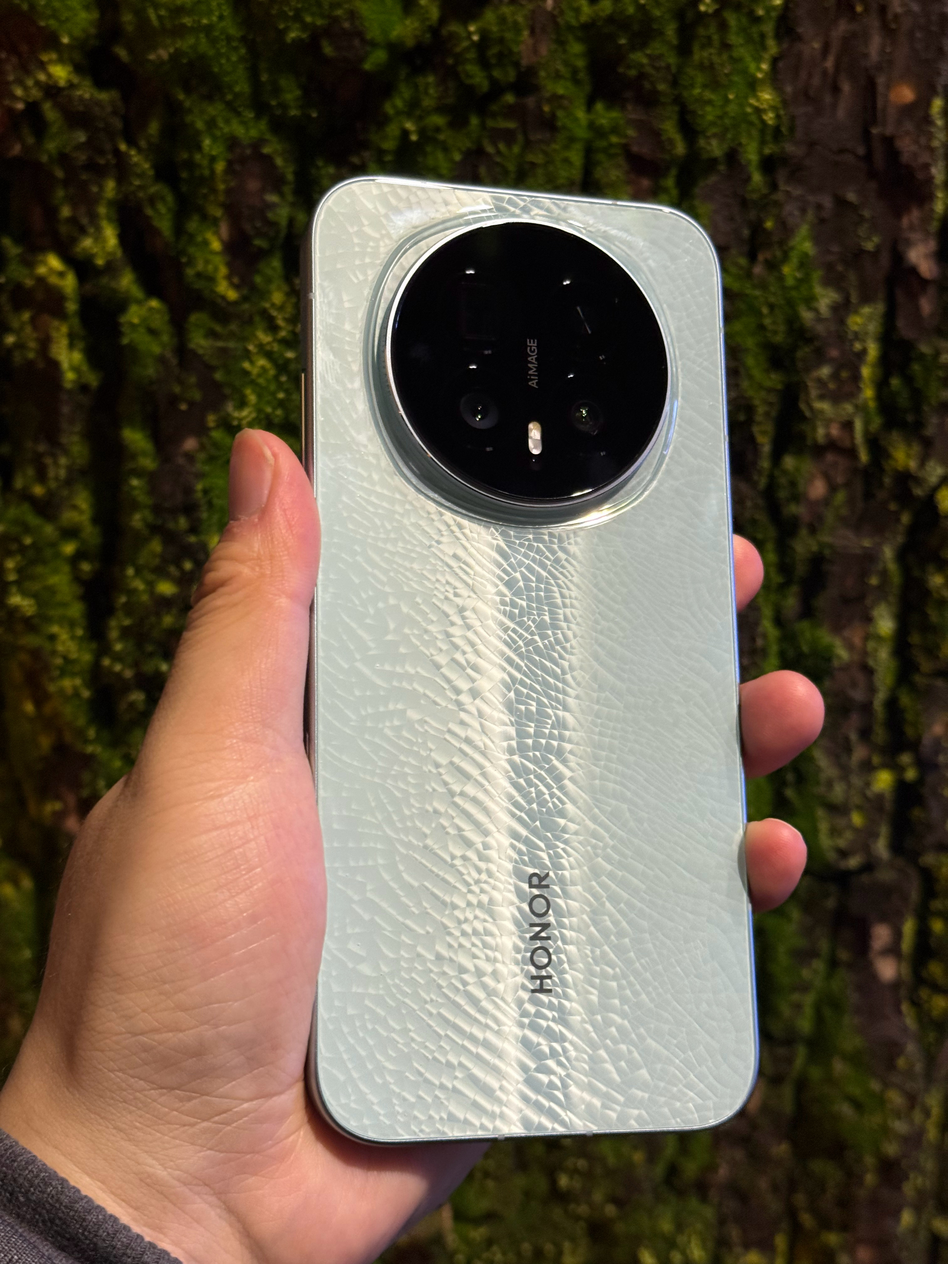 找了一个反光角度,给大家看看荣耀Magic8天青釉配色的后壳效果,冰裂纹,太有特点了……这个配色让人拿在手上真忍不住想多看几眼,还有手感也绝了,不大不小,直边+大R角。设计的很精致,体验上惊喜也不少,虽然是标准版,但是用着总能有“很Pro”的错觉[doge]