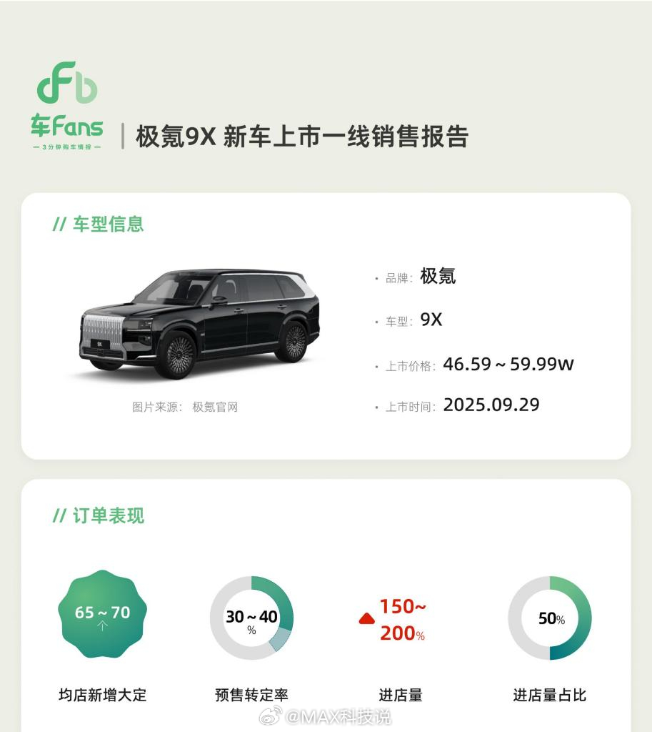 这样一款品质和人气都不错的车,销量自然也是杠杠滴。极氪9X均店新增大定65~70台,预售转定比例高达30~40%。50万价格定位的产品,可以说是现象级产品了!