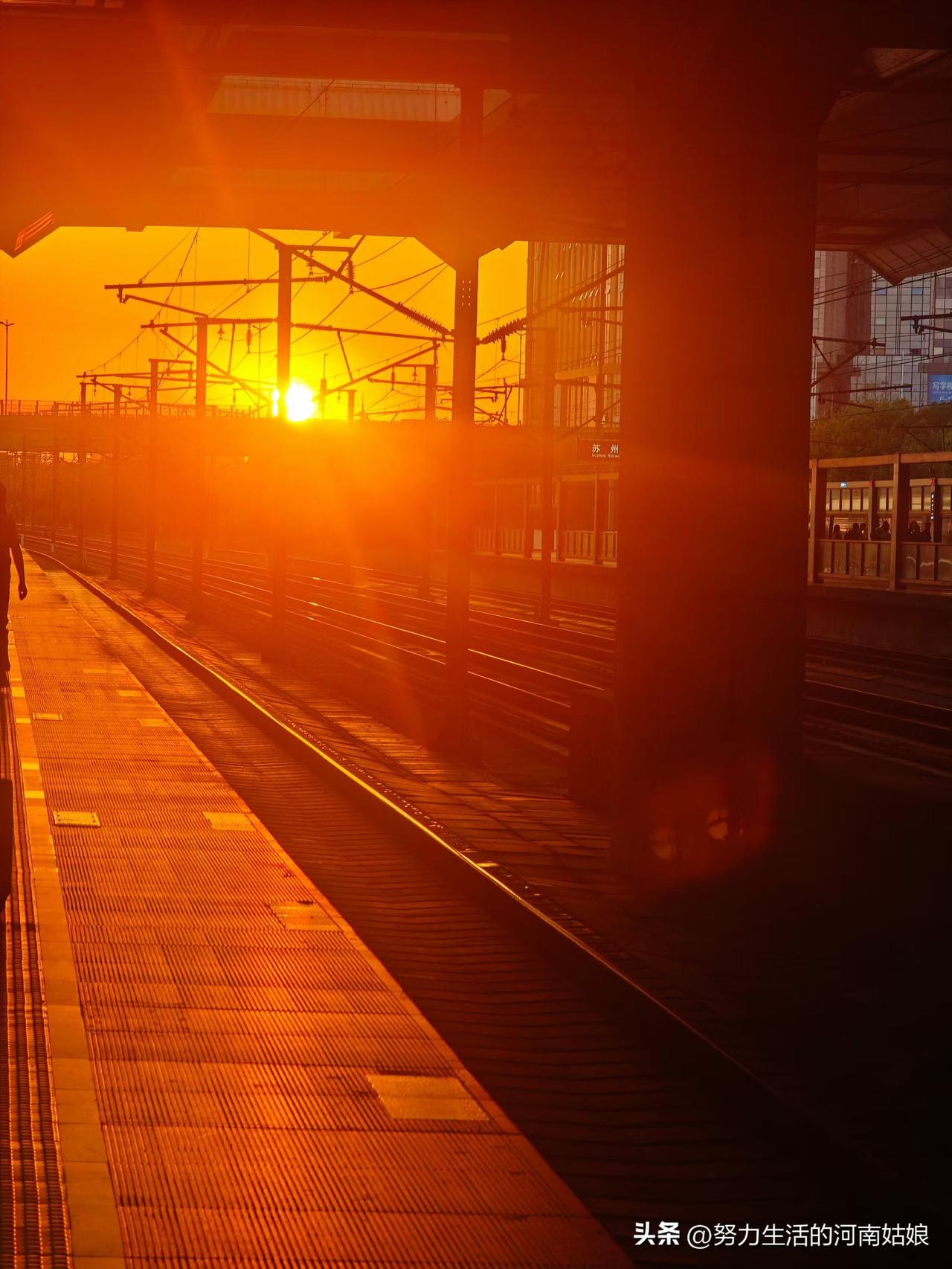 站台的落日也太会了!把铁轨、信号灯都染成了暖黄色,连远处的电线杆子都好看了不少。