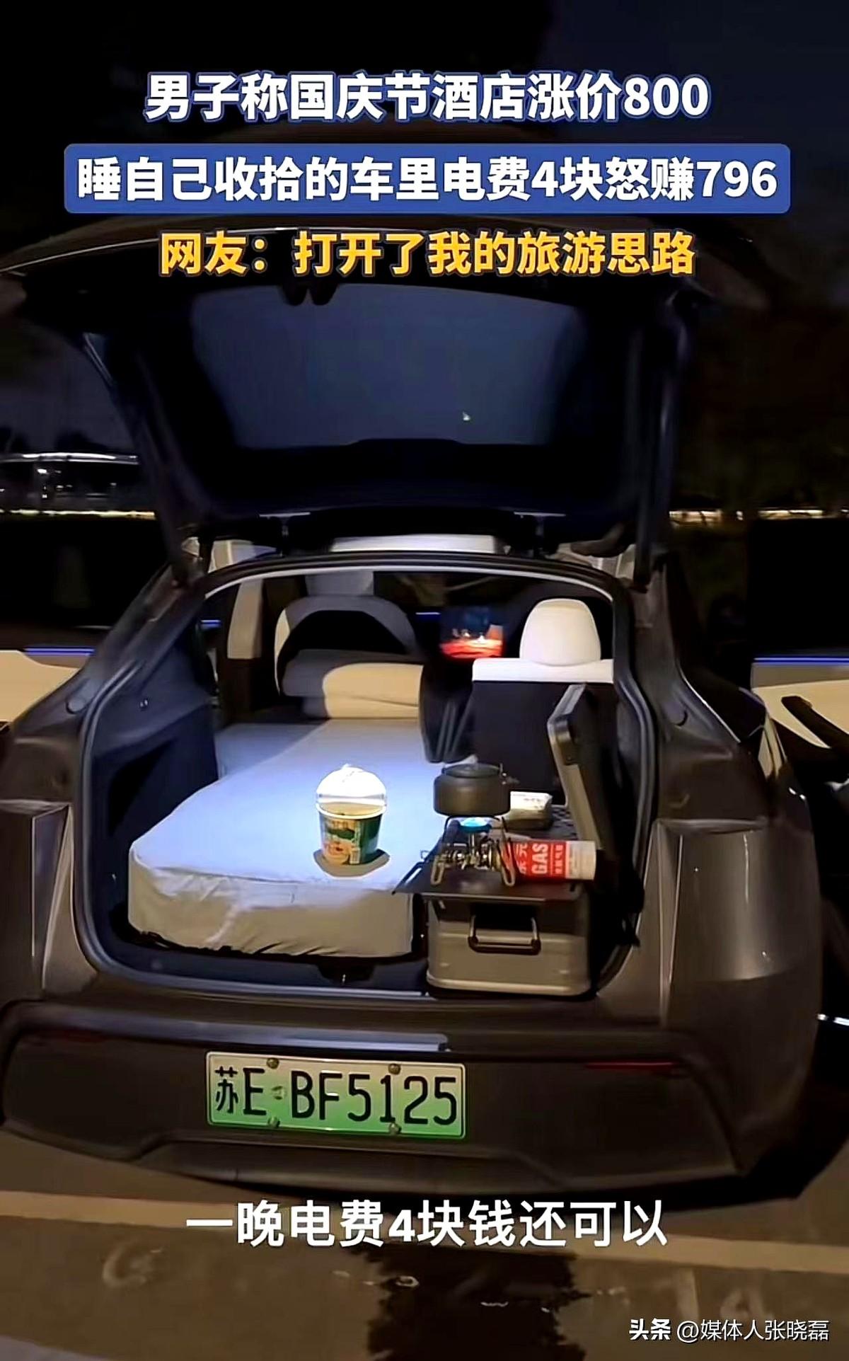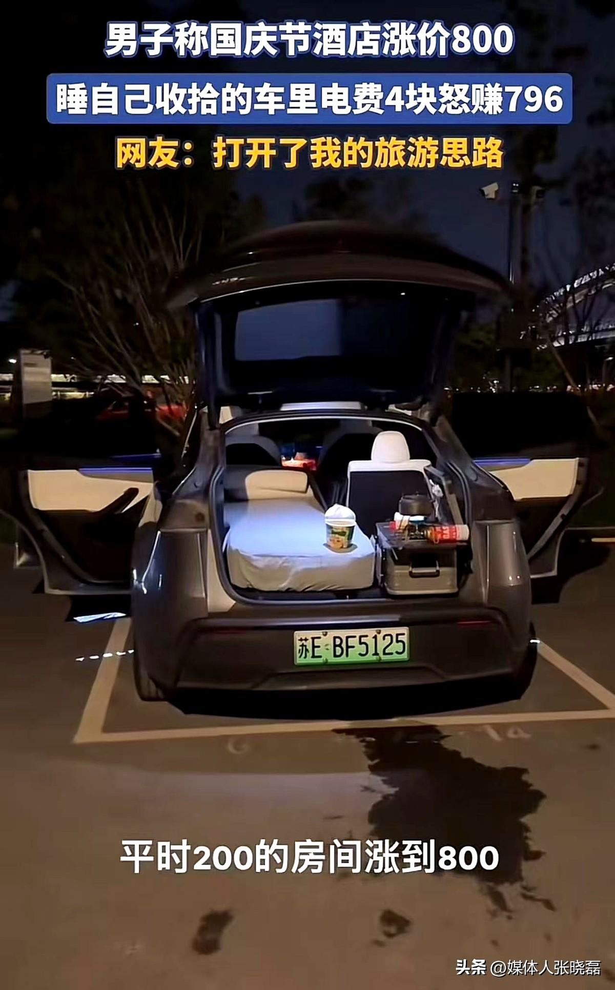 “资本割不动年轻人了!”国庆假期,酒店房间从200涨价到800,男子思路打开,直接睡车里,一个晚上才4块钱的电费,怒赚796块! 这波操作让网友纷纷点赞:“整顿奸商,还得靠年轻人啊!”男子把自己的这段经历分享到了网上,没想到引发了热议。 有网友说,我国庆就是这样干的! 省下的住宿费吃香的喝辣的,别提多爽了! ”然而,也有网友持不同意见,他们说,这钱真没必要省! 不洗澡怎么行? 而且休息不好,第二天哪还有心情玩? 网友对此表达观点: 能买Y的人也不差钱,但是现在的人越发清醒和理智,该花花该省省。 洗澡很简单,下午开到城里,钟点房几十元一小时,几个人洗个澡休息一下,精神抖擞继续前进! 我就知道未来肯定是电车的天下!就像一部手机不仅仅是用来打电话。 挣不来钱一晚上十块钱都贵,错不是酒店贵,是当下挣不来钱了[打脸]