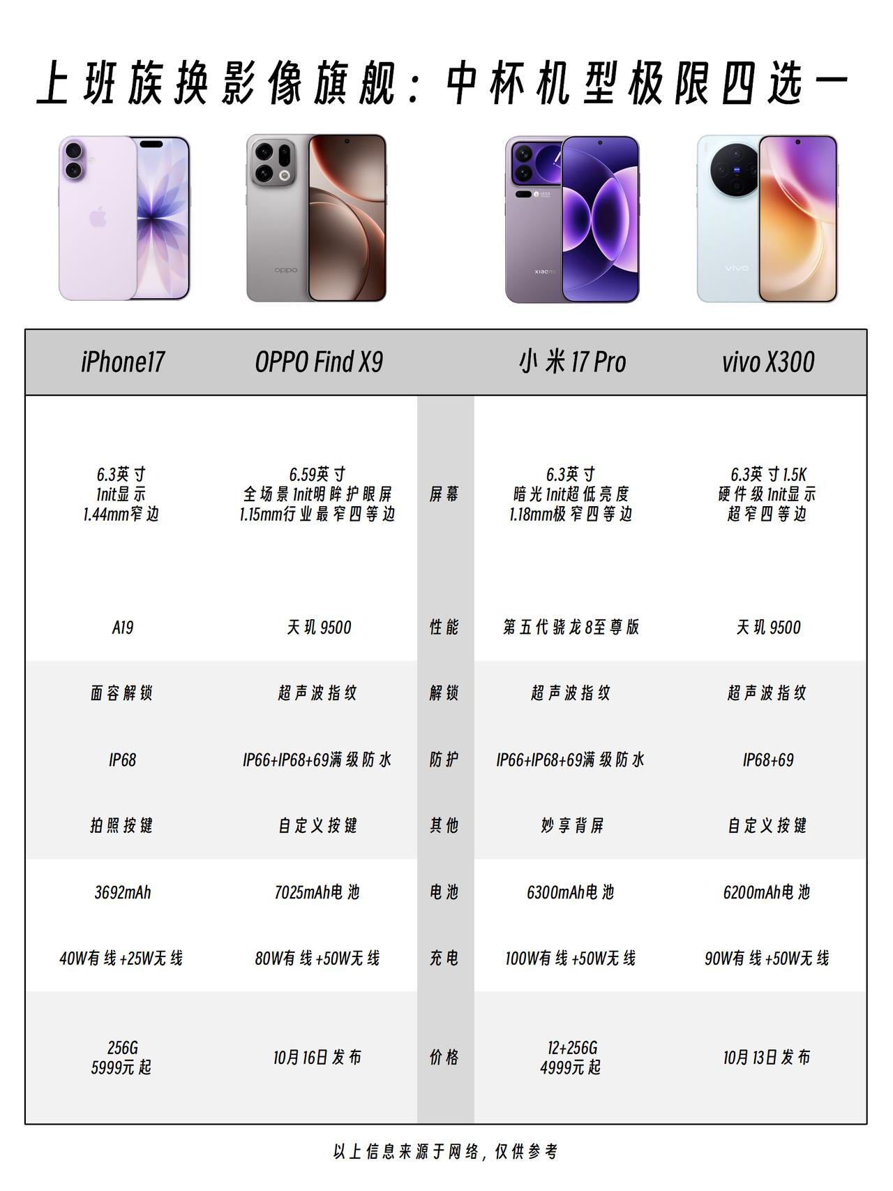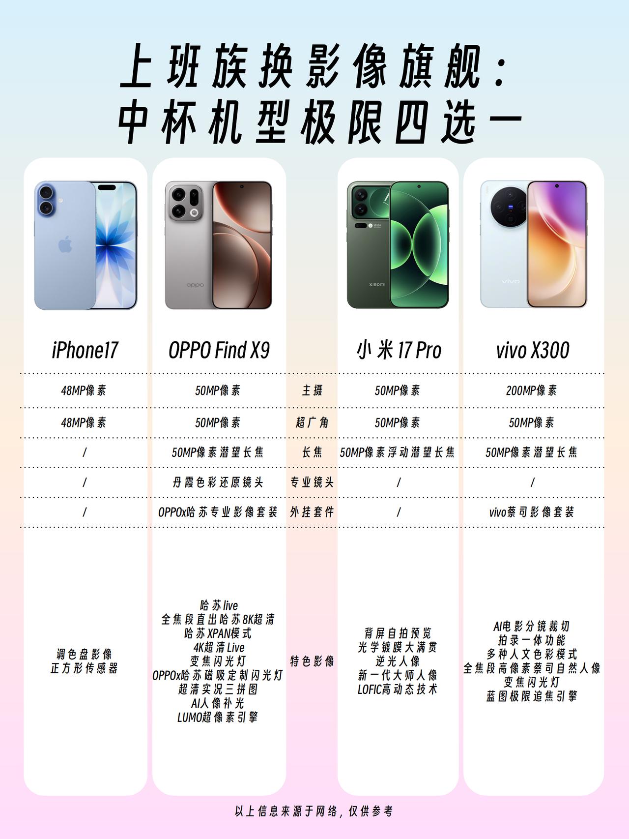 急急急!上班族该选哪款? 上班族刚过完国庆精神有点恍惚了,还想出去玩!!!打算年底前换台手机,到时候元旦假期出去玩拍照好点的(国庆假期用老iPhone拍的照片在朋友圈有点拼不过了。。。) 主要就是拍照好,续航好点的,出去玩不用老担心电量问题就行了,正好下半年新机多,就稍微看了一下,现在就是整个纠结住了 iPhone 17的话是大家都说性价比好,苹果难得一见。vivo X300是蔡司三摄拍照不错,有潜望长焦拍景区也挺舒服的,就是电池没上7000有些些可惜。 小米17 Pro徕卡影像的色调我也挺喜欢的,背屏创新也很大胆。OPPO Find X9感觉硬件都挺强的,哈苏四摄,也有潜望长焦,主要是拍Live图还更好点,支持4K Live,女朋友比较喜欢拍实况,后面再搞个哈苏影像套装拍演唱会也不错。 我自己是比较偏向OPPO的,毕竟拍照强,电池还是更大的7025mAh,日常用舒服点,更全面,大家觉得选哪款更好点哦? 新手机 OPPOFindX9 来拍照了 手机摄影 iPhone17 vivoX300 小米17Pro