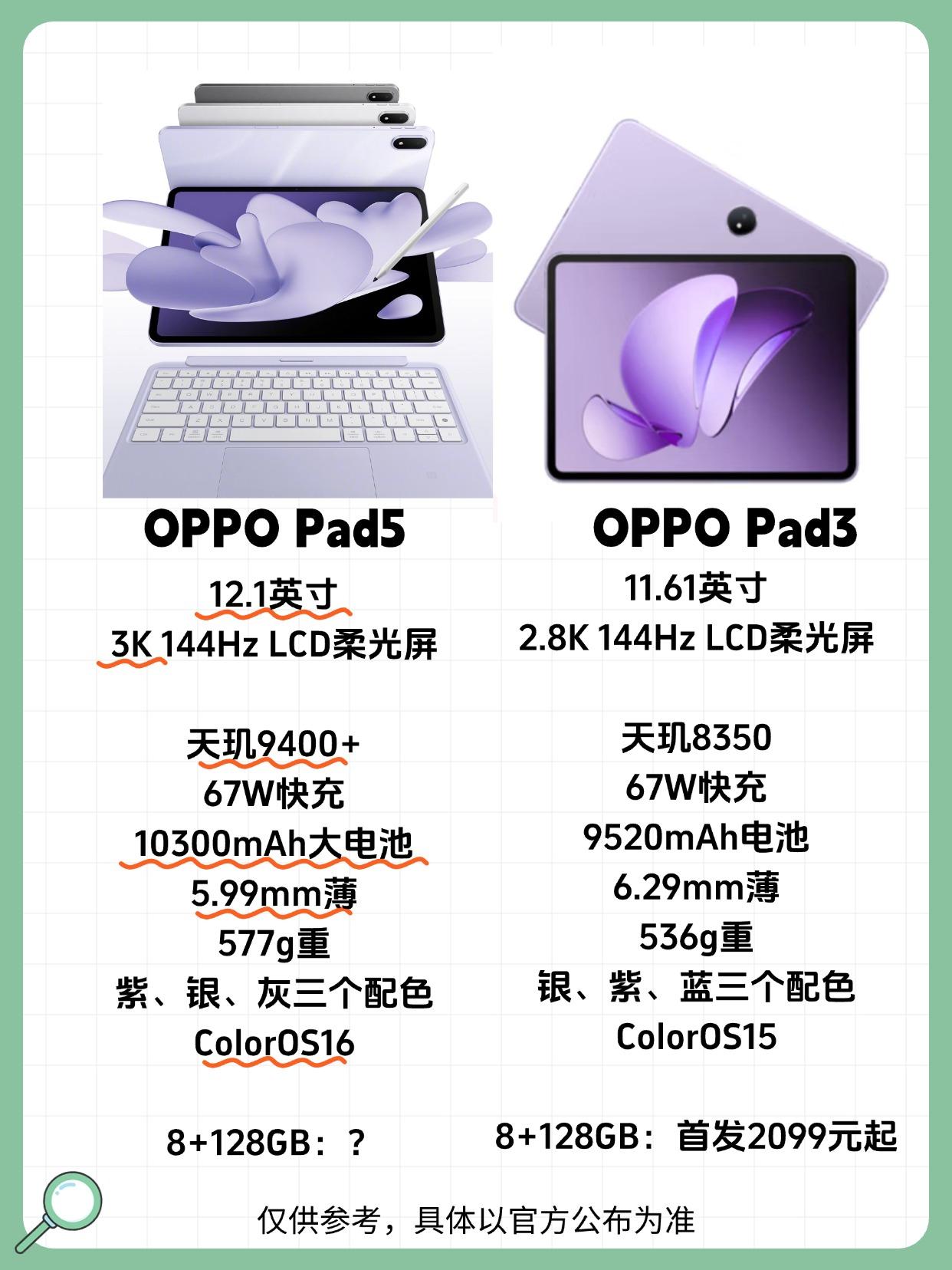 莎莎同款!新款OPPO Pad 5升级点一图看懂 孙颖莎代言,OPPO Pad 5马上来啦!不少宝子好奇新款都有哪些升级,值不值得入,这里帮大家整理好了升级点,马住就完事了~ 相较于OPPO Pad 3,新款可以说是全方位升级了,处理器天玑9400+性能大幅提升,来到旗舰梯队,配合全新升级的ColorOS16,日常使用、游戏体验想必都会更好,丝滑板王预定 另外就是屏幕更大了一点,分辨率也升级3K,还是LCD柔光屏,重视护眼的不用担心了。尺寸更大的同时电池也更大了,来到了10300mAh,不过厚度反而变薄了点,更加便携 现在主要就是看价格了,前代首发2099起,这代大家觉得会是多少起步呢?不过这款是标准版,价格应该会比OPPO Pad 4 Pro便宜,性价比应该挺不错的, OPPO平板 OPPOPad OPPOPad5 孙颖莎同款OPPO平板 平板电脑 平板电脑推荐