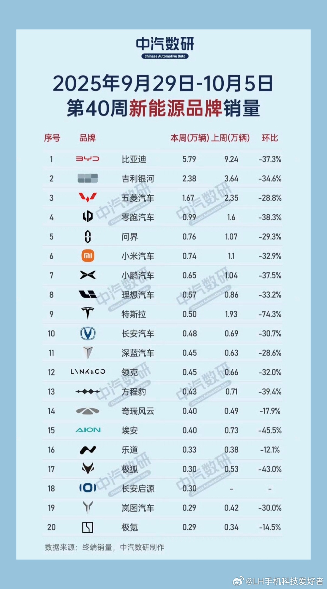 2025年9月29日志10月5日期间,中国新能源汽车市场销量集体下滑,主要是因为处于国庆假期期间,都放假了,所以这个数据看看就好。