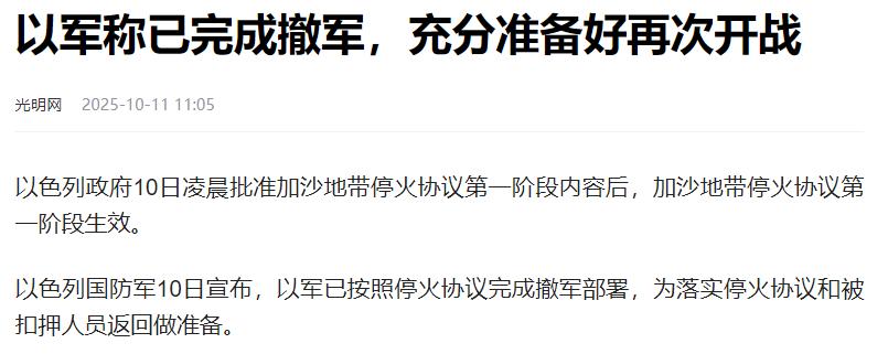 以色列和美国联手做了加沙和谈的局,哈马斯派出首领去埃及参加和谈;没想到不到24小时,以色列军队再次对加沙发起了攻击,打得哈马斯措手不及,密密麻麻的轰炸,无休无止的炮火,令整个大加沙地区陷入巨大的麻烦。 当地时间10月6日,哈马斯和以色列的代表都赶到埃及沙姆沙伊赫开会,连斡旋的埃及都在旁边帮着协调,看着两边都有谈的诚意,外界都觉得这下和平总算有盼头了,气氛一时间特别积极。 可没想到,哈马斯代表团还在开罗跟斡旋方抠谈判细节的时候,以色列安全内阁成员埃尔金突然放了个“大招”,公开说哈马斯必须解除武装。 这要求对哈马斯来说根本不可能答应,明摆着就是没打算好好谈。 果然,埃尔金说完还不到24小时,以色列的战机就一群群地飞向加沙,空袭直接把谈判营造的和平氛围搅得稀碎。 面对这种军事压力,哈马斯只能让步,同意释放人质,暂时停火协议这才签下来。从表面上看谈判好像成了,加沙暂时停火了,但这背后的门道其实很清楚。 美国作为以色列最铁的盟友,虽然没直接站出来,但从它一直支持以色列的态度就能看出来,肯定少不了掺和。毕竟在中东的事儿上,美国和以色列向来是一伙的,这早就不是秘密了。 而且协议里还明确,美国要和卡塔尔、埃及等国组成工作组,盯着双方执行协议,这更说明美国从一开始就深度参与其中。 现在加沙是停火了,但以色列并没真的完全撤出。按照协议,以军撤到了所谓的“黄线”,可这条线还在加沙里面,以军发言人说了,这样是为了保持防御和控制能力,要是谈不拢随时能再打。 停火后72小时内,哈马斯得释放所有以色列人质,包括遗体,以色列也会放巴勒斯坦囚犯,不过交换过程都不让媒体报道。以色列总理内塔尼亚胡也强调,以军还控制着加沙的关键区域,这其实就是在继续给哈马斯施压。 目前来看,人质释放确实是缓和局势的关键一步,但这种靠打出来的和平到底能撑多久,谁也说不准。 加沙的未来目前还是一片模糊,而靠强权逼出来的妥协,从来都不是真正和平的根基。
