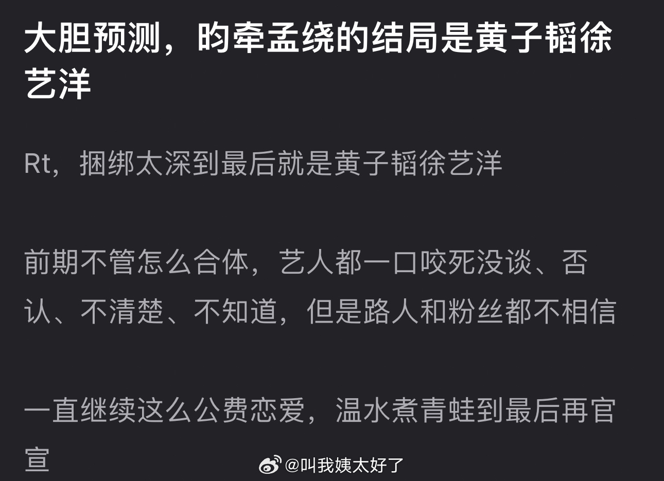 有网友说感觉昀牵孟绕的结局是黄子韬、徐艺洋,前期不管怎么合体,都一口咬死没谈、否认、不清楚、不知道,但路人和粉丝都不相信,一直继续这么公费恋爱,温水煮青蛙到最后再官宣,大家怎么看? ​​​