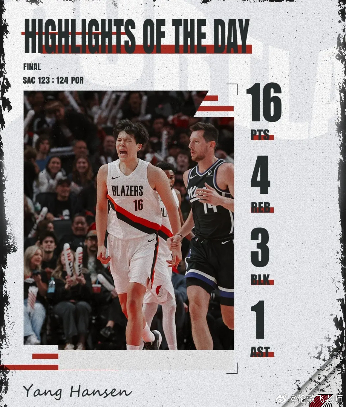 两分多钟的时间他先投三分再秀梦幻脚步连拿10分,这一节杨瀚森5中5独得14分,末节开拓者又是先拿9分将分差拉开到两位数,但顽强的国王此后还是将悬念打了回来,关键时刻乐福连拿8分然而最后两罚全丢留给对手机会,雷诺补扣扳平比分,乐福再次主导进攻抛投压哨造成犯规,这次两罚中一惊险收下比赛,最终开拓者险胜国王获得首胜。