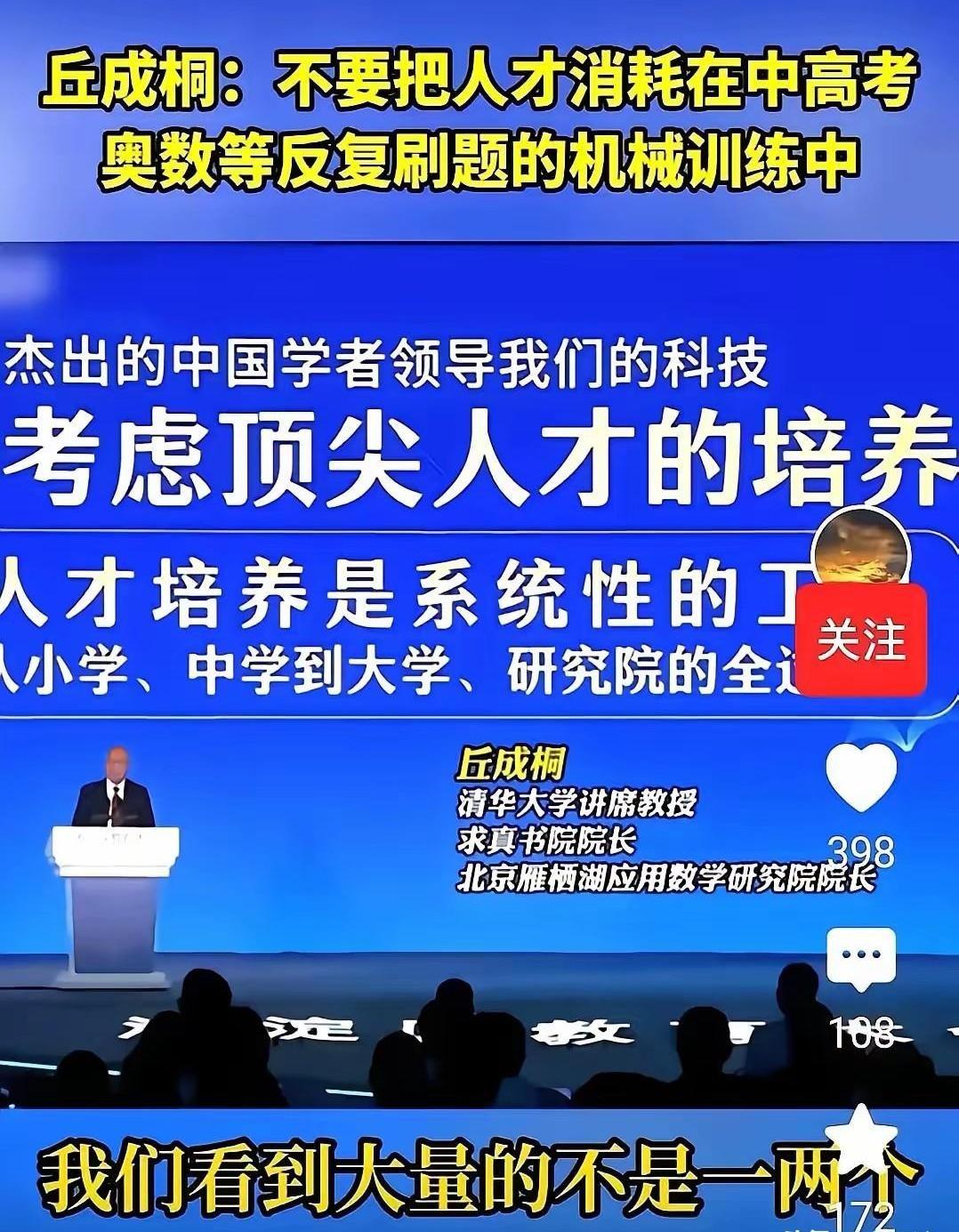 著名数学家丘成桐一句话,戳到了无数家长和学生的痛处。 他说,不要再把我们的人才,消耗在没完没了的中高考和奥数刷题里。 这话听着解气,可现实却让人无奈。 为什么大家明知道反复刷题不好,还要拼命让孩子去学?因为高校录取名额是有限的,你不去争,别人就占了你的位置。这不是培养兴趣,这是一场实打实的淘汰赛。 在这种规则下,机械地反复练习,就成了最管用的提分方法。家长和孩子们不是不懂,是没办法。 这样做的代价太大了。它磨掉的不是孩子的时间,而是对知识最宝贵的好奇心。我们用这种方式培养出了很多考试的高分者,但可能也因此失去了未来的创新者。 当学习不再是探索世界的乐趣,而成了一项必须完成的枯燥任务,我们国家未来发展最需要的原创思想和顶尖人才,要从哪里来? 丘成桐先生指出了问题的根本,可谁敢第一个停下来?在选拔方式没有改变之前,哪个家庭敢拿孩子的前途去尝试? 这真是一个让人左右为难的现实问题。