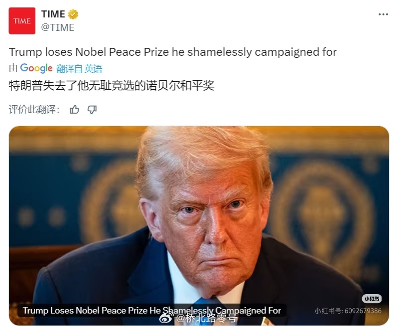 美国“时代”杂志:特朗普失去了他无耻竞选的诺贝尔和平奖。