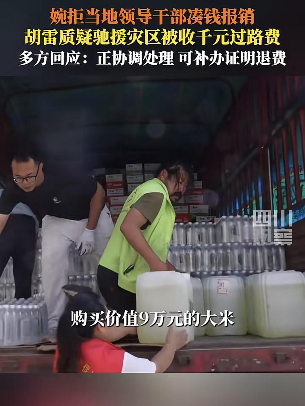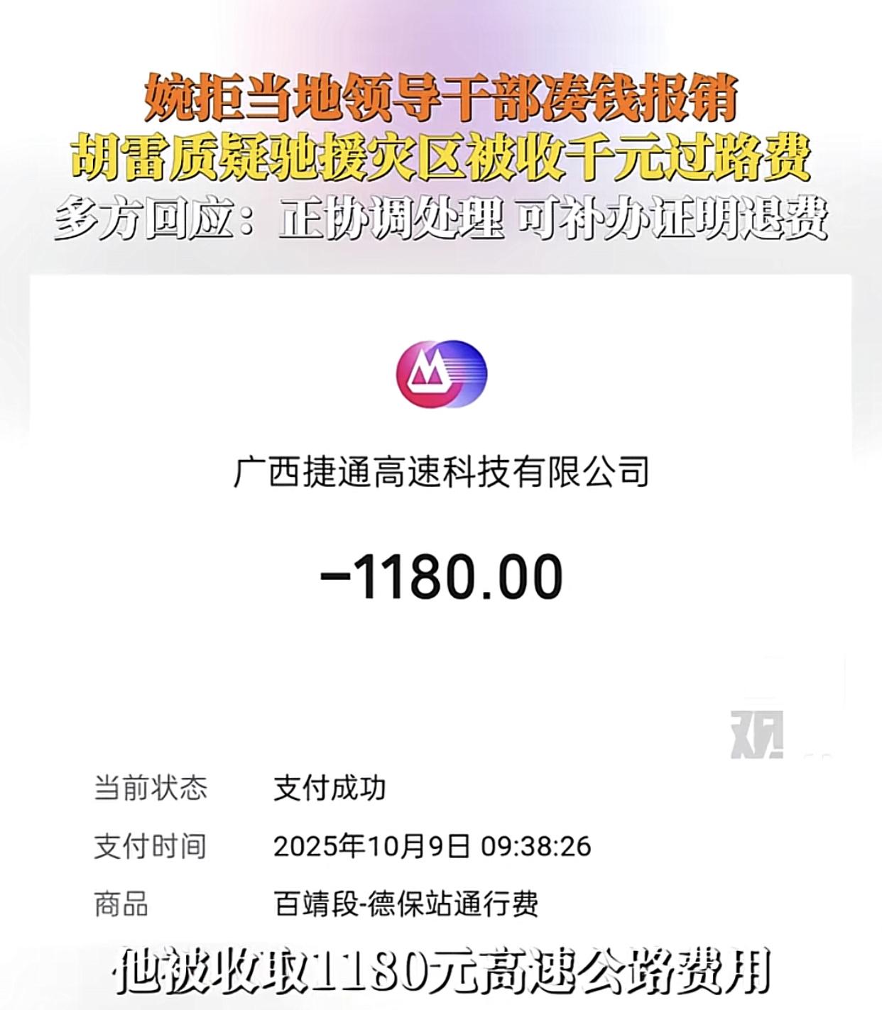 广西高速百色德保收费站火了,驰援灾区物资,一样收费! 甘肃靠拾荒为生的残疾爱心人士胡雷,近日,捐赠了9万多元的救灾物资前往受台风影响的广西百色德保灾区!当车辆行驶百靖段下德保高速时,车辆走的是ETC自助通道,收取了胡雷1180的费用!本是善心好意捐赠,却收了1180元过路费,胡雷不淡定了,将此事在网上发布。 事后,德保有关部门说可补办证明退费,当地的高速公路和民政部门也积极协调处理中。其中一名副局长和其他几位干部私自凑了2000元弥补他的损失,却被胡雷婉拒。 (来源:四川观察) 这就让人纳闷了,为什么婉拒? 翻看了他的原版视频,原来他只是报备了车辆,没有等高速公路方的批复免费文件就急忙上高速了。言下之意,相关收费站也没有接到该车免费的相关信息,导致被收取了所有费用。 那么问题来了,婉拒了你还发到网上干嘛呢,慈善值得提倡,爱心值得肯定。但是,不能用这种事博同情,那只能适得其反了。
