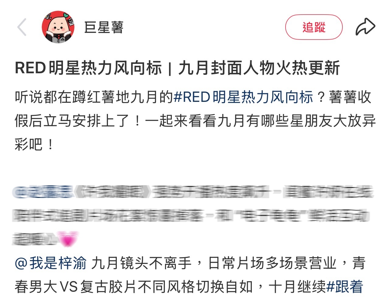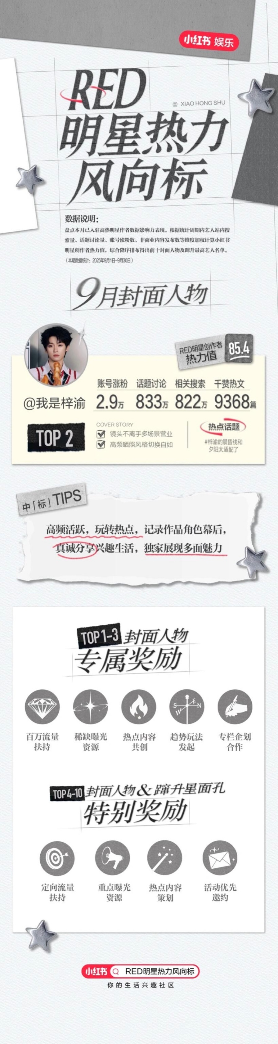 梓渝获RED明星热力风向标TOP2登九月封面人物,好厉害呀,热度真的每个平台都很